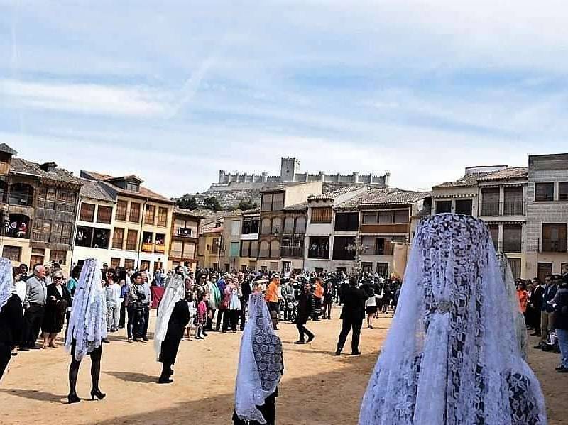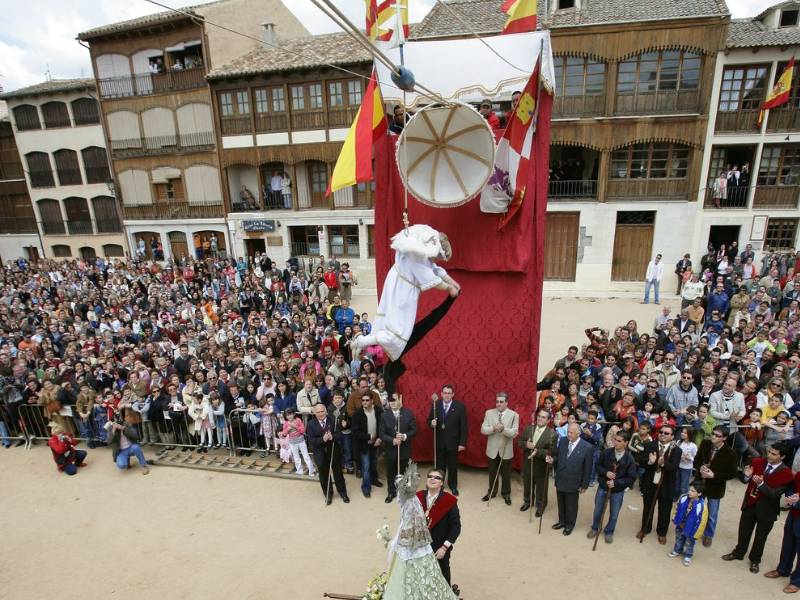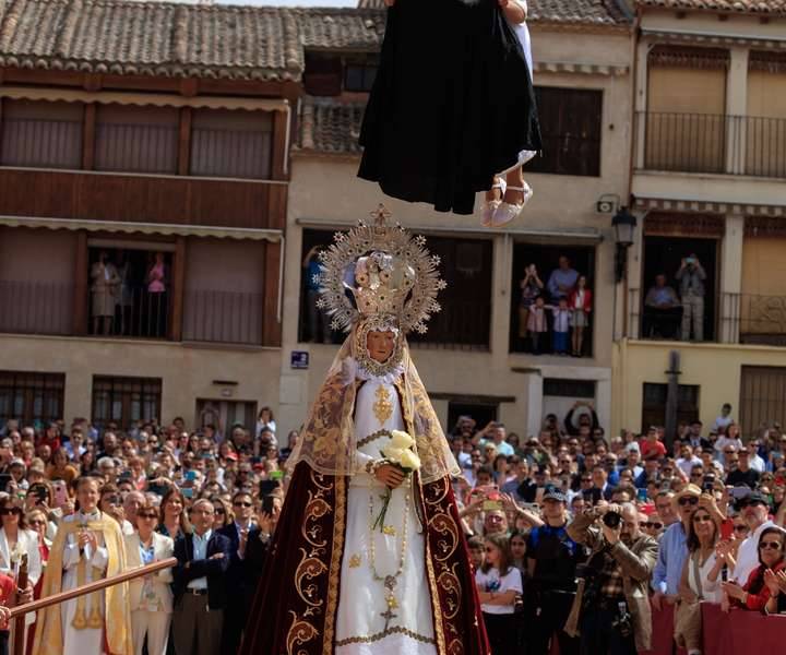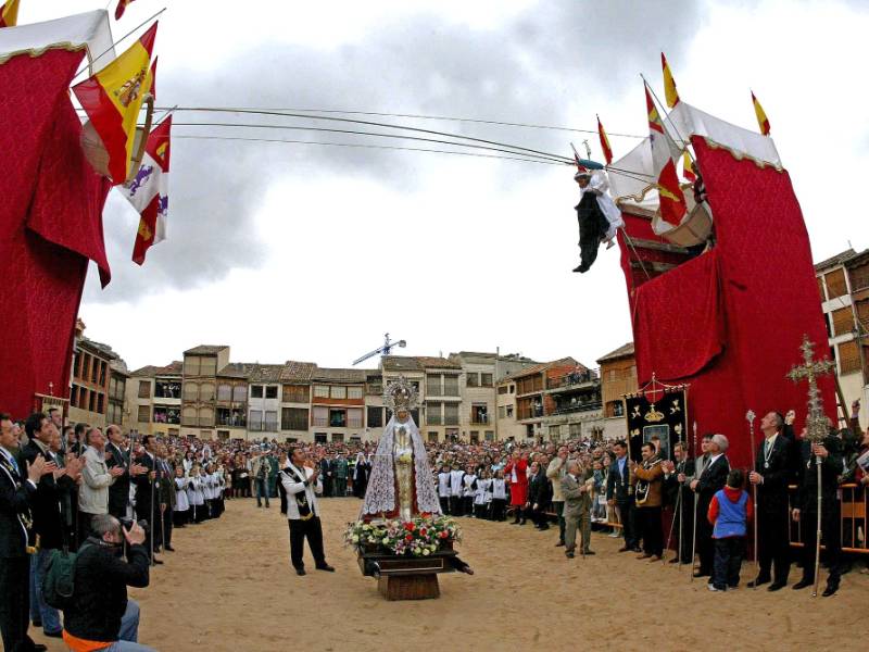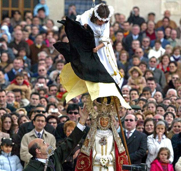 In this event, an image of the Virgin, covered in a black veil, in mourning, and accompanied by the sad music of the Municipal Band, leaves in a procession from the church of Santa María towards the medieval Plaza del Coso. There it is placed on a pedestal that is located between two tall towers with a wooden frame covered with red damask. At a certain moment, when the Virgin is already seated, a large white fabric balloon emerges from the top of one of the two towers, which has always been moved by a set of ropes that join the towers at their highest part. . The balloon stops in the middle of the space between the two towers, at the top, and opens, revealing inside a child dressed in the innocent whiteness of angels and adorned with a golden crown and two wings. Thanks to a system of pulleys, the angel descends hanging, releases two doves and comes into contact with the Virgin who is below him. Then he removes the black veil from the mourning mother of Christ and is elevated again, kicking and moving the veil frantically. The crowd breaks into applause and the Municipal Band plays the national anthem. The Resurrection of the Savior has been represented.