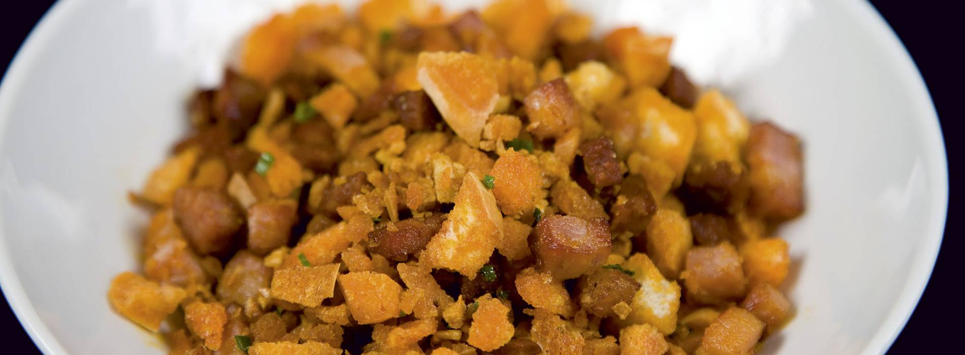 Heat the oil and fry the garlic along with the bacon and the chorizo for about five minutes. Add the paprika and fry it gently. Then add the crumbled bread, the parsley and the water. Stir well so that all the flavors mix and, at the same time, to evaporate the water.