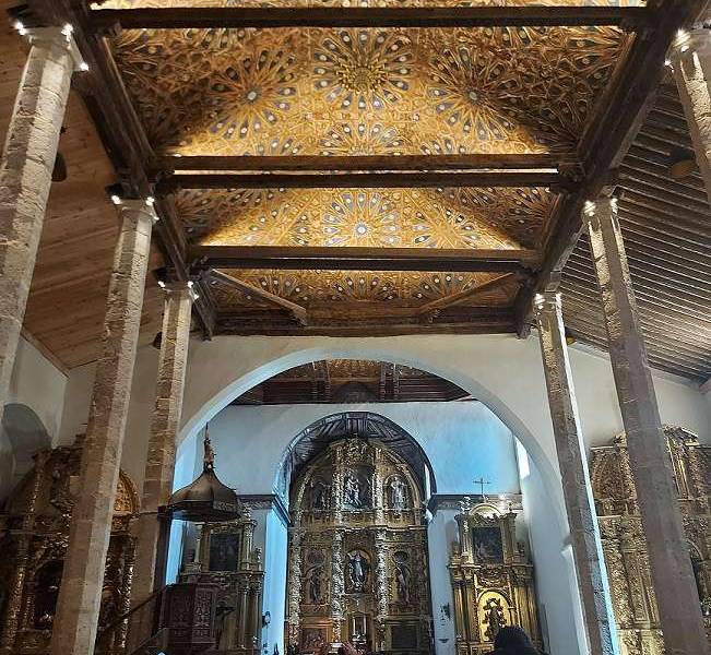 The pillars support coffered ceilings covering the whole church, except the main chapel. The Epistle front is Catholic Monarch style. There is an image of the Assumption by Alejo de Vahía dating from the 15th century.