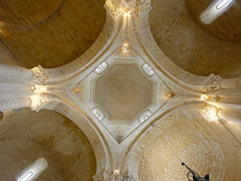 There are two interesting turrets in the corners of the gable end and a Gothic crucifix of the 13th century. Inside, the three naves are divided into five sections, the fifth one being higher than the rest and forming the transept. The naves are covered by round barrel vaults. The lateral vaults are lower and narrower than the central and transept ones, and rest on round arches.