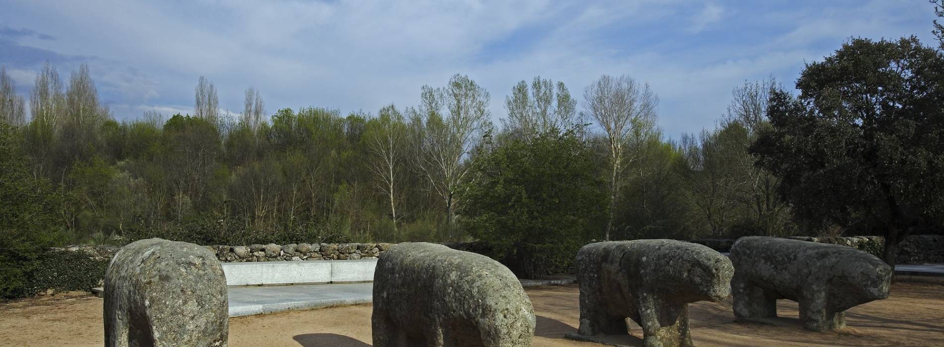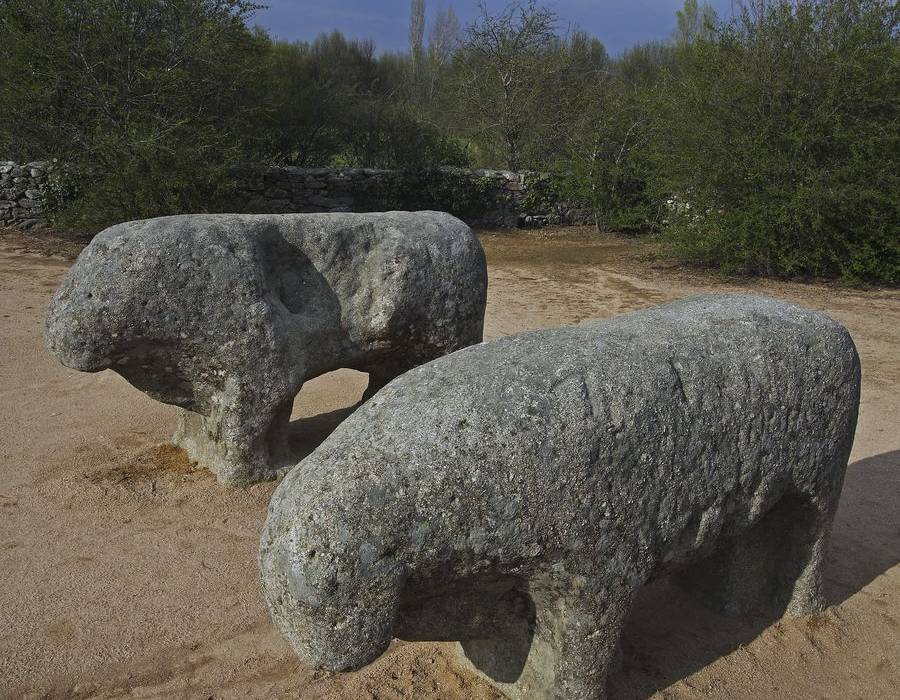 The Bulls of Guisando are attributed to the Vettones and date back to the 3rd century BCE. They consist of four granite sculptures representing four-footed animals, believed to be bulls or boars, and are considered to have a magic-religious function to aid fertility or protect livestock. An alternative theory is that they were used to mark the boundaries of pastureland.