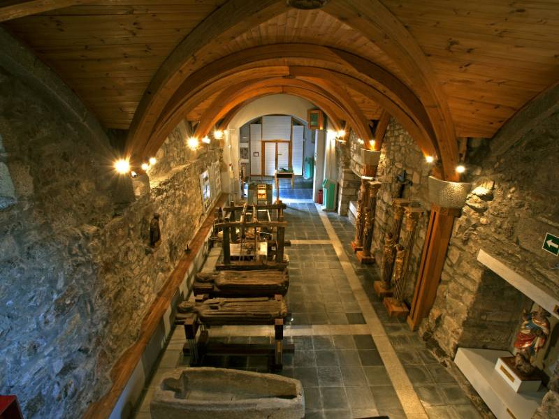 The granite seating and slate stand out as construction material. On the western or western façade there is a folded arch and a protogothic rose window, in addition to the main portal that is embedded in the year 1571. The relief of the titular saint, San Martín, appears who shares his cape with the beggar and the inscription of the primitive foundation.