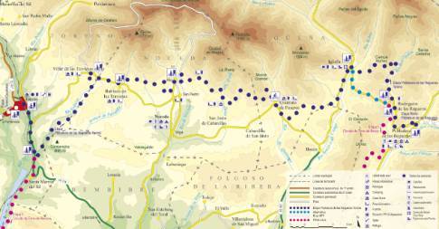 The route continues from Prado along a forest path that crosses the train track again, this time over an overpass, and begins a steep but brief climb to Alto de la Cruz. Further on, the track enters an area of oak forest and joins the Camino de Velilla, along which it descends towards the town of La Llama de la Guzpeña, protected in a ravine.