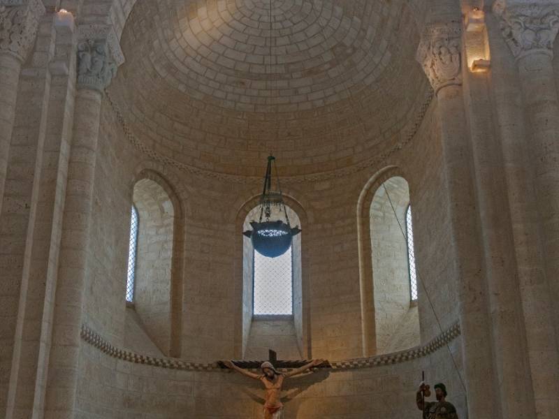 Son interesantes las dos torrecillas altas en las esquinas del hastial y el Crucifijo gótico del siglo XIII. En el interior, las tres naves se dividen en cinco tramos, cuatro de ellos de las mismas dimensiones y el quinto de mayor altura, que constituye el crucero. Las naves se cubren con bóveda de medio cañón, son más bajas y estrechas las laterales que la central y la del crucero y descargan en arcos de medio punto.