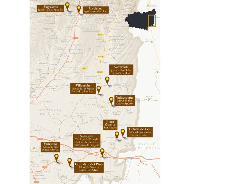 La Ruta de los Retablos Platerescos del Este de la provincia de León, la componen diez pueblos, ocho del sureste leonés y dos de la montaña oriental leonesa, estos pueblos son los que a continuación se detallan: