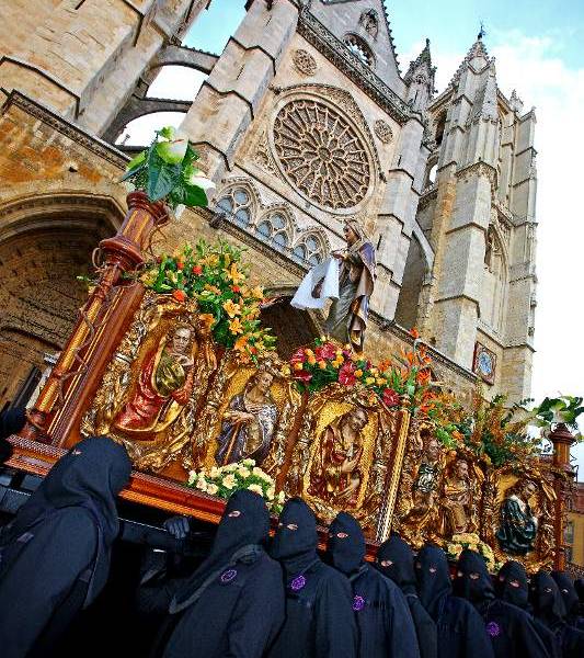 The festivities go on for ten days, starting with the emotional procession carrying the ancient image of the Virgen del Camino, known locally as la del Mercado (she of the market) on the afternoon of Viernes de Dolores (The Friday of Pain), and finishing with the releasing of doves on the morning of Domingo de Resurrección (Resurrection Sunday) in the cathedral square. The sixteen fraternities and penitential brotherhoods organise some thirty processions, a hundred parades with spectacular sculpted saintly images born on the shoulders of the brothers, processions of the Vía Crucis (the Way of the Cross), parades of lyrical worship, concerts and proclamations. All going on in the middle of the major celebrations.