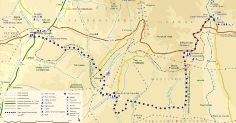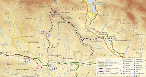 Imagen en alta resolución. Este enlace se abrirá mediante lightbox, puede haber un cambio de contextoSaliendo de La Vecilla por la carretera autonómica CL-626 en dirección a Boñar, y tras salvar el río Curueño, tomamos un primer desvío a la izquierda para subir por una pista de tierra hasta la vecina localidad de Otero. Al otro lado del pueblo, la ruta continúa por el camino del apeadero hasta salir a la carretera local de Ranedo. Esta vía local nos lleva por el este hasta el cruce con la carretera autonómica, la cual hay que atravesar para iniciar el descenso hacia el valle del Porma por otra pista forestal. Cruzando la carretera, el itinerario utiliza un ramal de asfalto abandonado para pasar sobre las vías del tren y continuar po el Camino de los Caminantes hasta Barrio de las Ollas. Bajando por la calle principal del pueblo, se sale a la carretera que conduce cómodamente, y tras atravesar el cauce del Porma, a la cercana villa de Boñar.