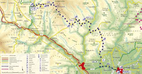 La route minière de Ríovelasco débouche sur la route de Bembibre , près de la ville de Santa Marina del Sil. Pour se diriger vers Toreno, le cycliste doit tourner vers le nord et parcourir un court tronçon de route large, avec de longues lignes droites et sans pente, avançant parallèlement au cours de la rivière Sil. Enfin, on entre dans Toreno par la partie basse du village et, après avoir traversé le pont sur le Sil, on monte jusqu'au croisement avec la route de Villalblino pour accéder au centre du village.