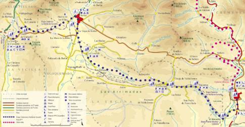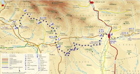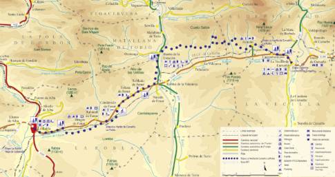 CacabelosImagen en alta resolución. Este enlace se abrirá mediante lightbox, puede haber un cambio de contextoCacabelosCruzando el puente sobre el río Cúa, la ruta sale de Cacabelos por la carretera de Villafranca del Bierzo. Enseguida se atraviesa la población de Pieros, al tiempo que se asciende un repecho entre viñedos que da paso a un rápido descenso, a cuyos pies se alcanza el desvío de Valtuille de Arriba. En el núcleo de esta apretada localidad se toma una callejuela que conduce a un cruce de carreteras por encima del pueblo. Allí la ruta gira a la izquierda en dirección a Pobladura de Somoza, comenzando una subida por carretera. No obstante, apenas un kilómetro y medio más adelante se abandona el asfalto para proseguir el ascenso por una pista de tierra que discurre a media ladera de una repoblación forestal, dando vista a los extensos viñedos de Cacabelos. De este modo, la subida culmina en la Campa de las Vigas, donde la ruta vuelve al asfalto para afrontar un largo descenso que, tras dejar atrás el desvío de Paradiña, finaliza en un cruce a orillas del río Burbia. En este punto se sale a una carretera más importante que comunica por la izquierda con Villafranca del Bierzo, si bien nuestra ruta gira a la derecha para llegar en un corto ascenso a Paradaseca.