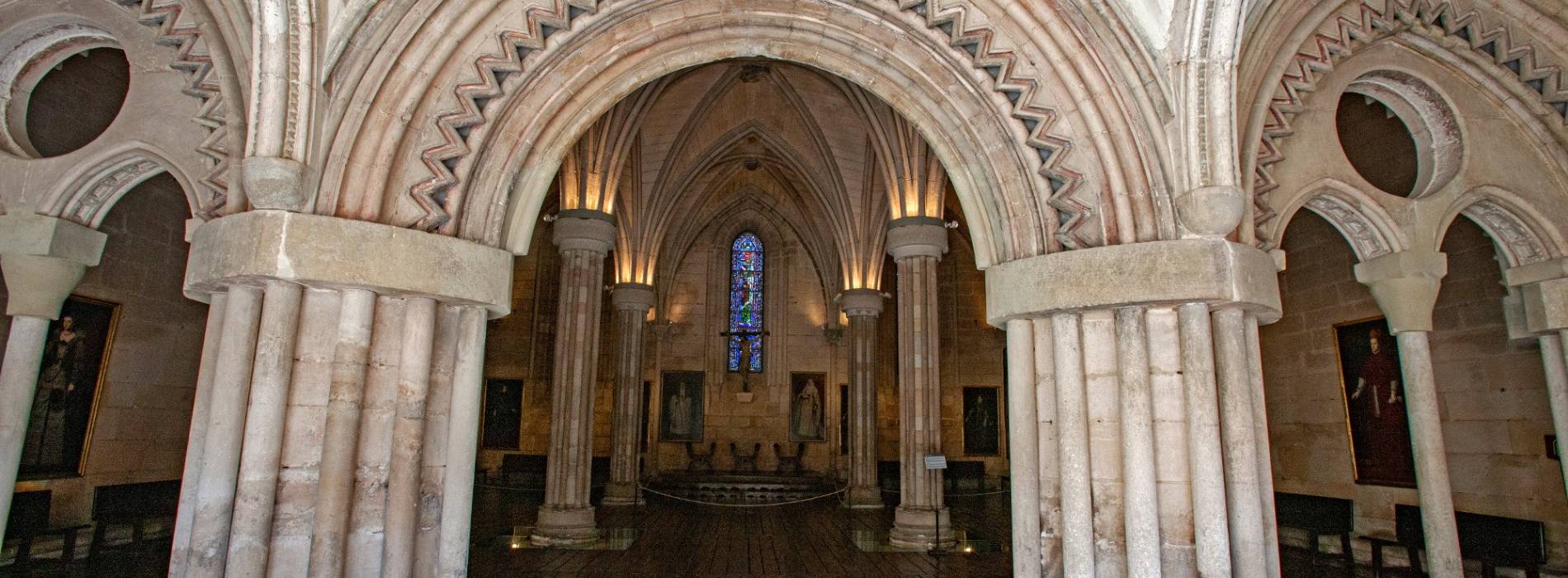 The exterior of the Monastery shows its strong defensive tower and remains of the walled enclosure. Surrounded by a crenellated wall, the monastery has a Romanesque and Gothic design.