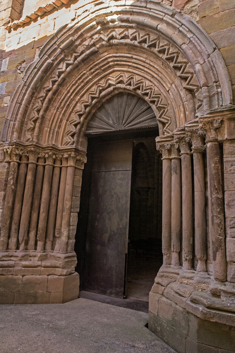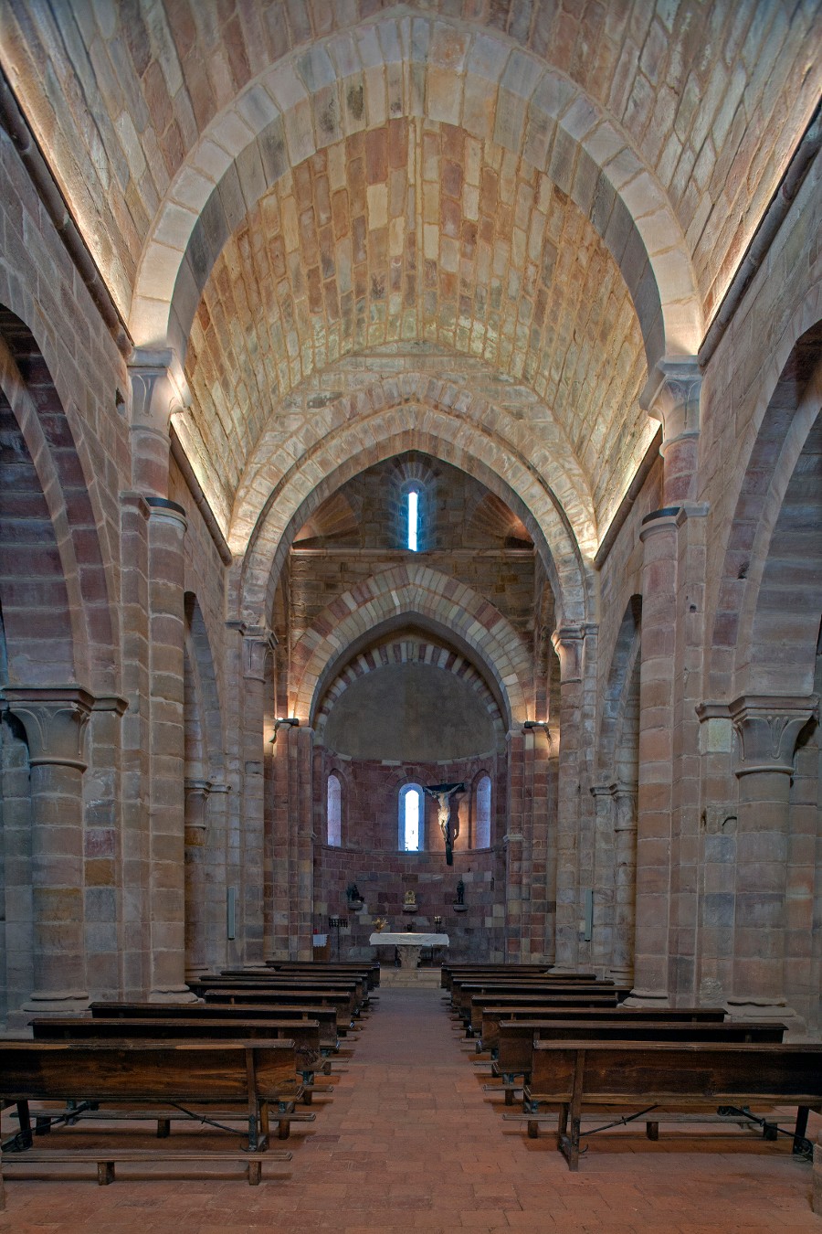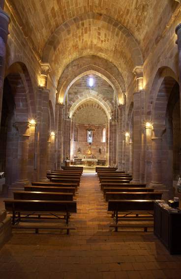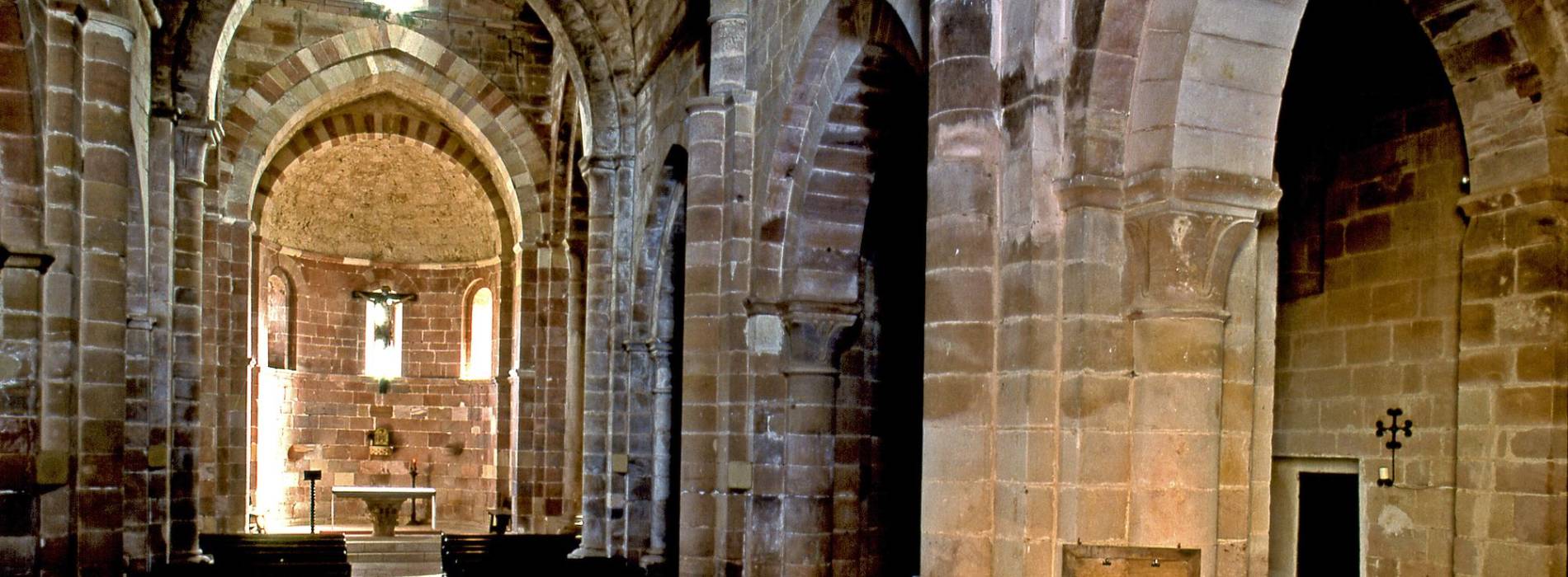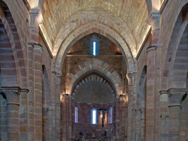 Il n’y a plus rien de l’ancienne construction préromane. Le cloître et le reste des dépendances annexes, aujourd’hui siège d’un complexe hôtelier, ont subi une complète reconstruction au long du XVIIIe siècle, mais de la maçonnerie romane l’église a été conservée intégralement, un grand bâtiment construit en pierre rouge, avec un triple chevet et trois nefs, un clocher mur et une haute coupole sur la croisée du transept.