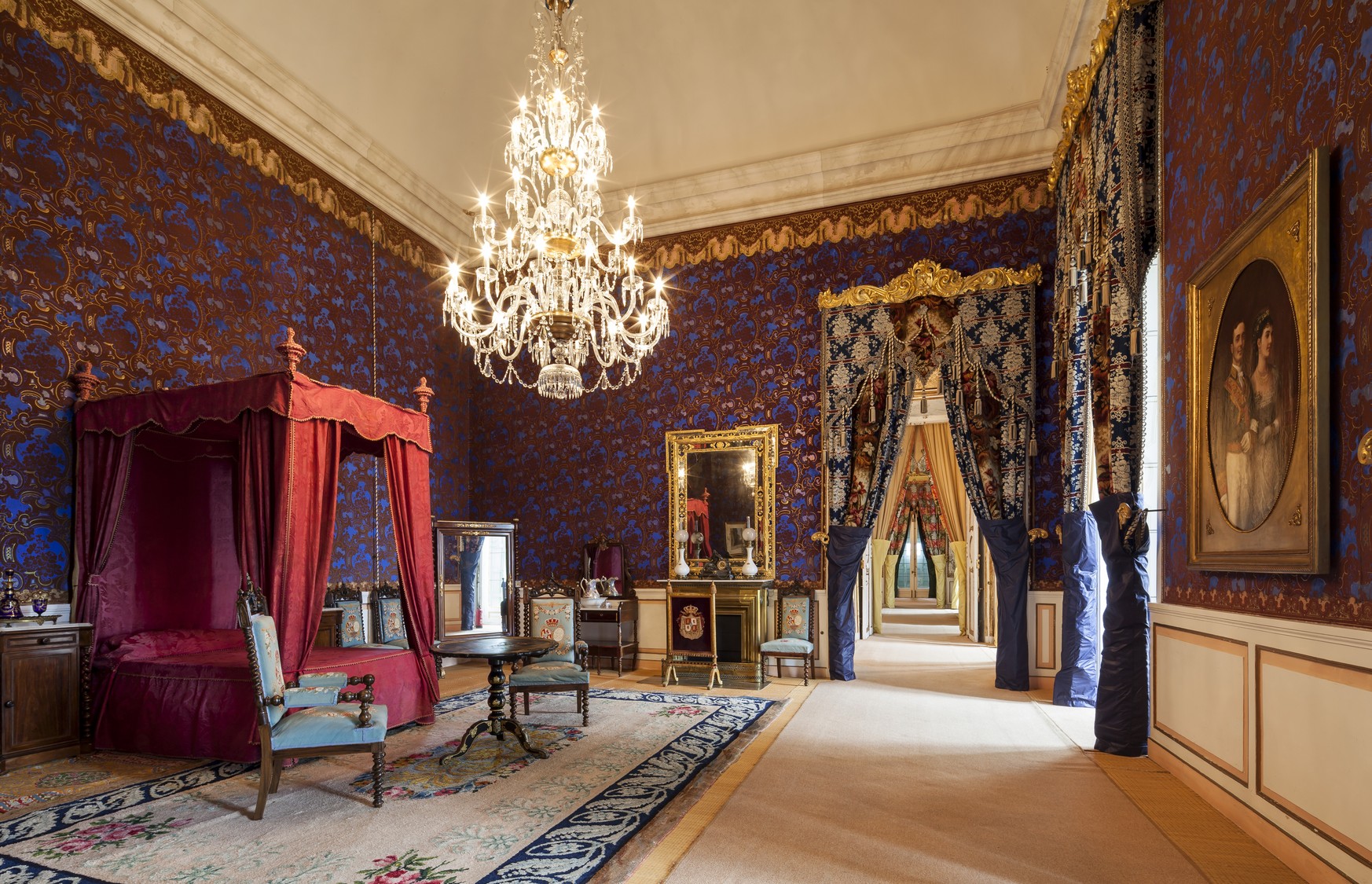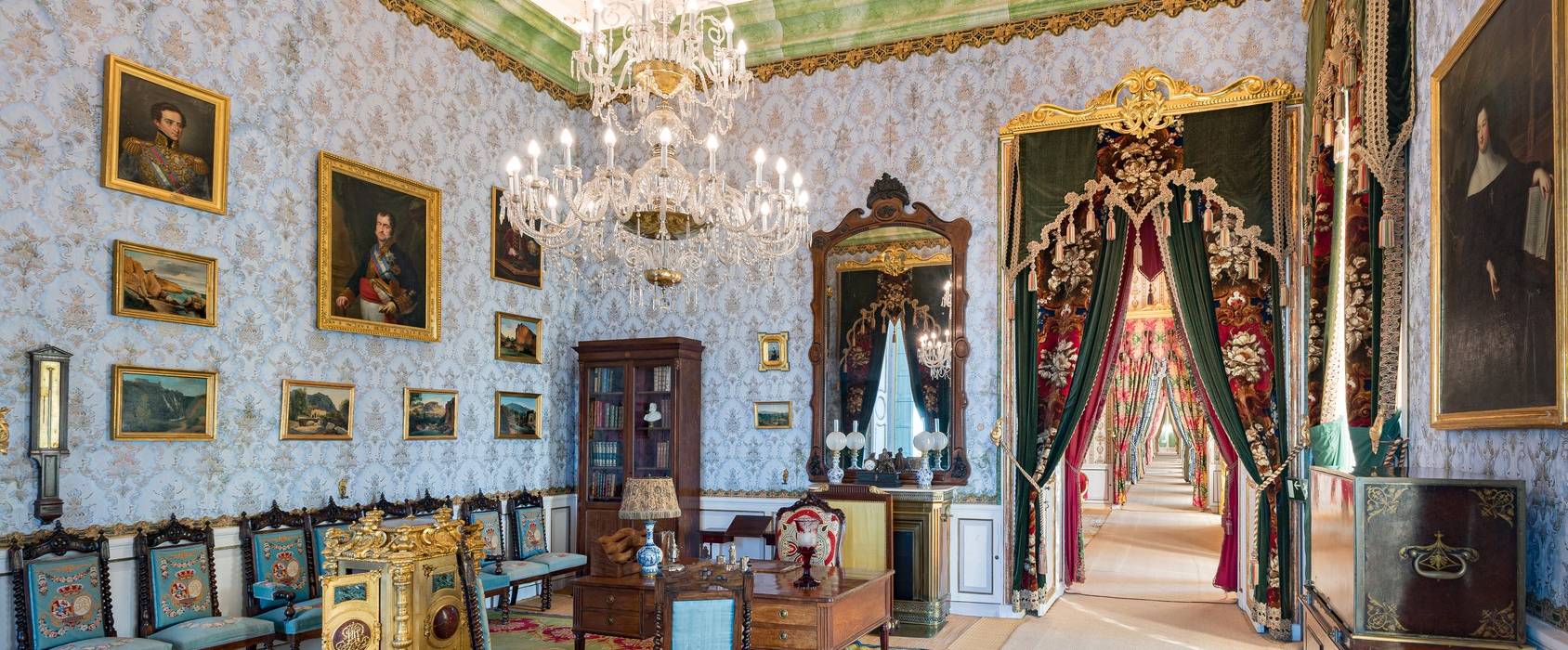 Palais construit avec de la pierre de taille grise ornée de maçonnerie rose. Le Palais conserve l'ambiance romantique du XIXème siècle. Les dépendances se situent autour du patio intérieur central et d'un escalier monumental, avec de grands salons décorés de somptueux mobilier d'époque (XIXème siècle).