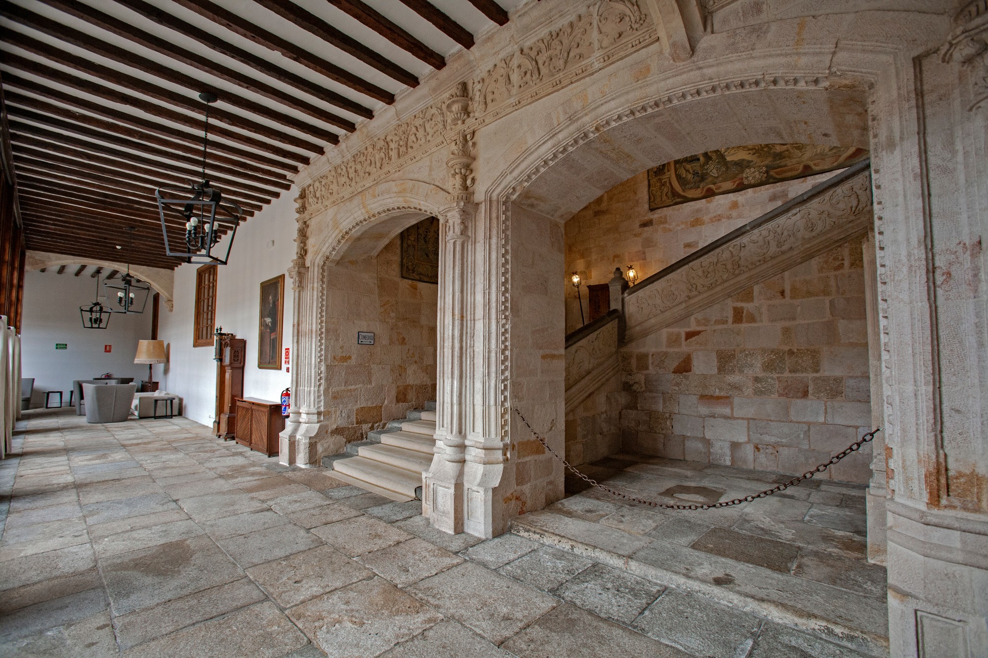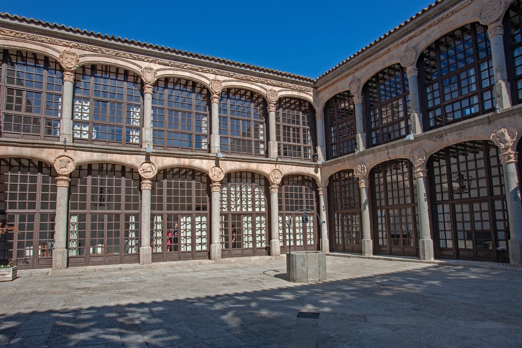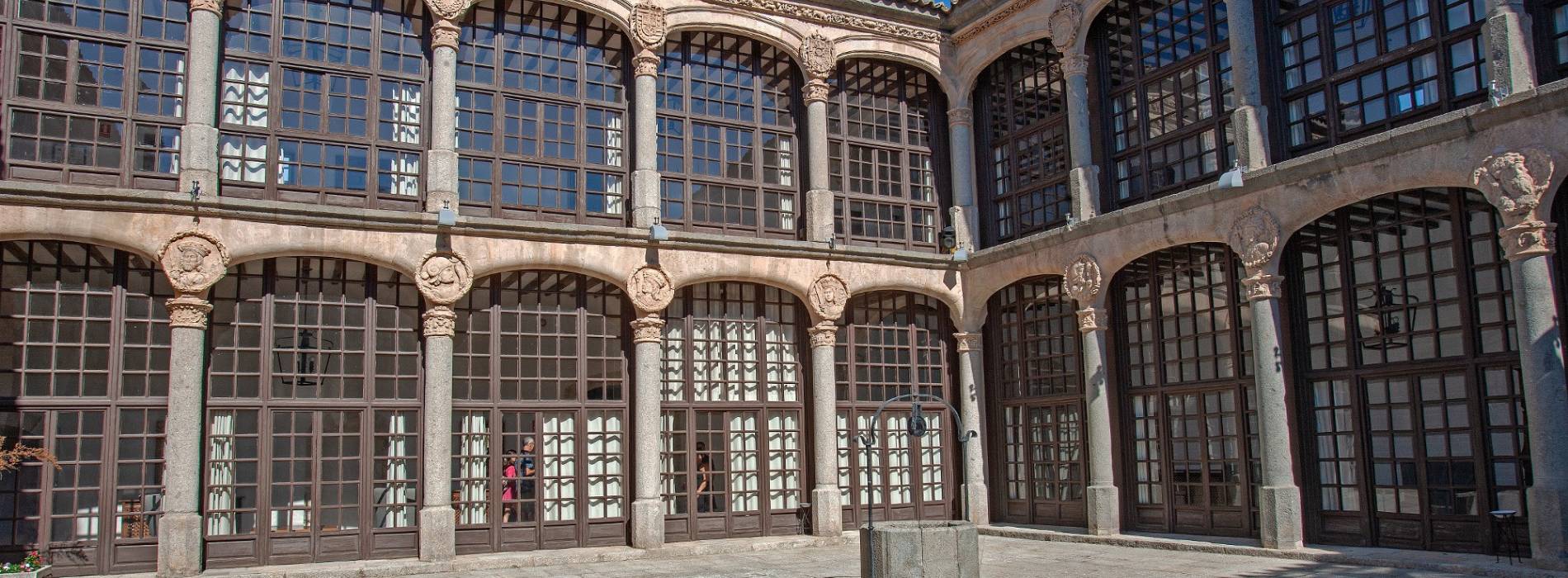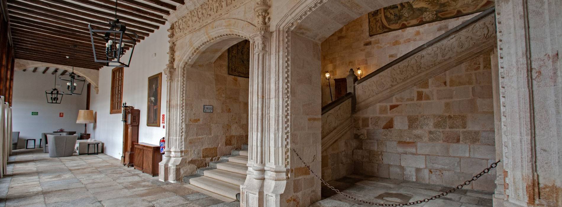 A l'intérieur, on apprécie un arôme médiéval riche en armures et tapisseries nobiliaires. Cela se combine avec le style renaissance de son patio avec une galerie d'arcs, une galerie vitrée en bois et des blasons héraldiques.