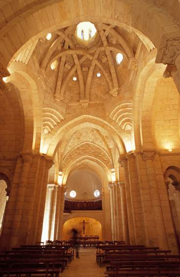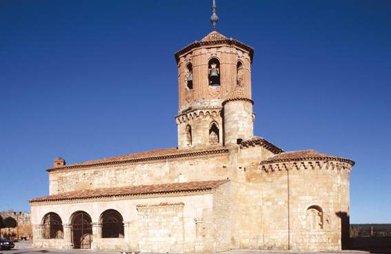 Levantada a mediados del siglo XII, mezcla del estilo cisterciense en su estructuración, el lombardo catalán en la decoración externa del ábside y la linterna, y la mudéjar en la cúpula y su decoración escultórica. Su fachada principal estaba oculta por una galería de dos pisos añadida en el siglo XVII, de la que sólo permanece el atrio.