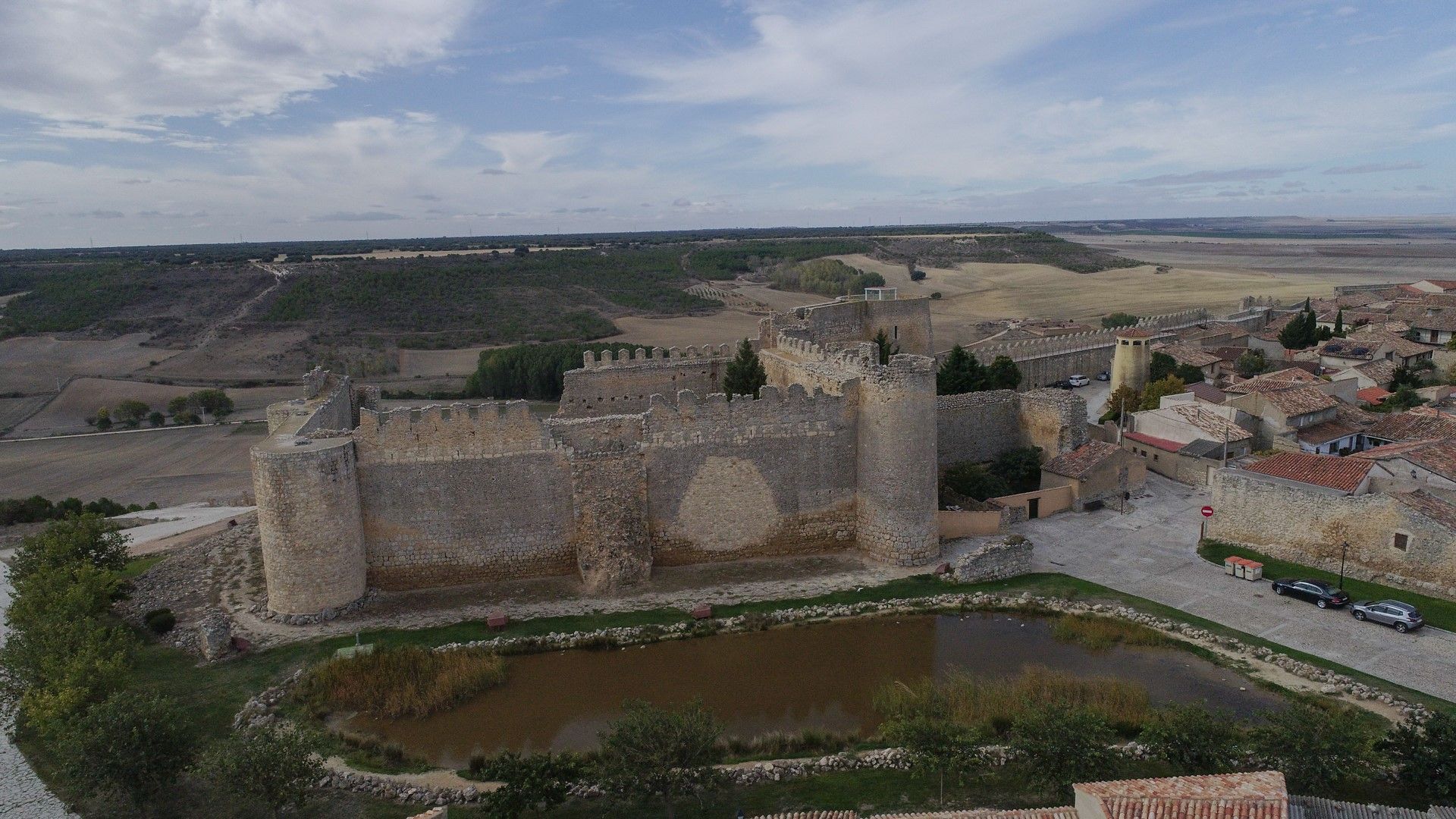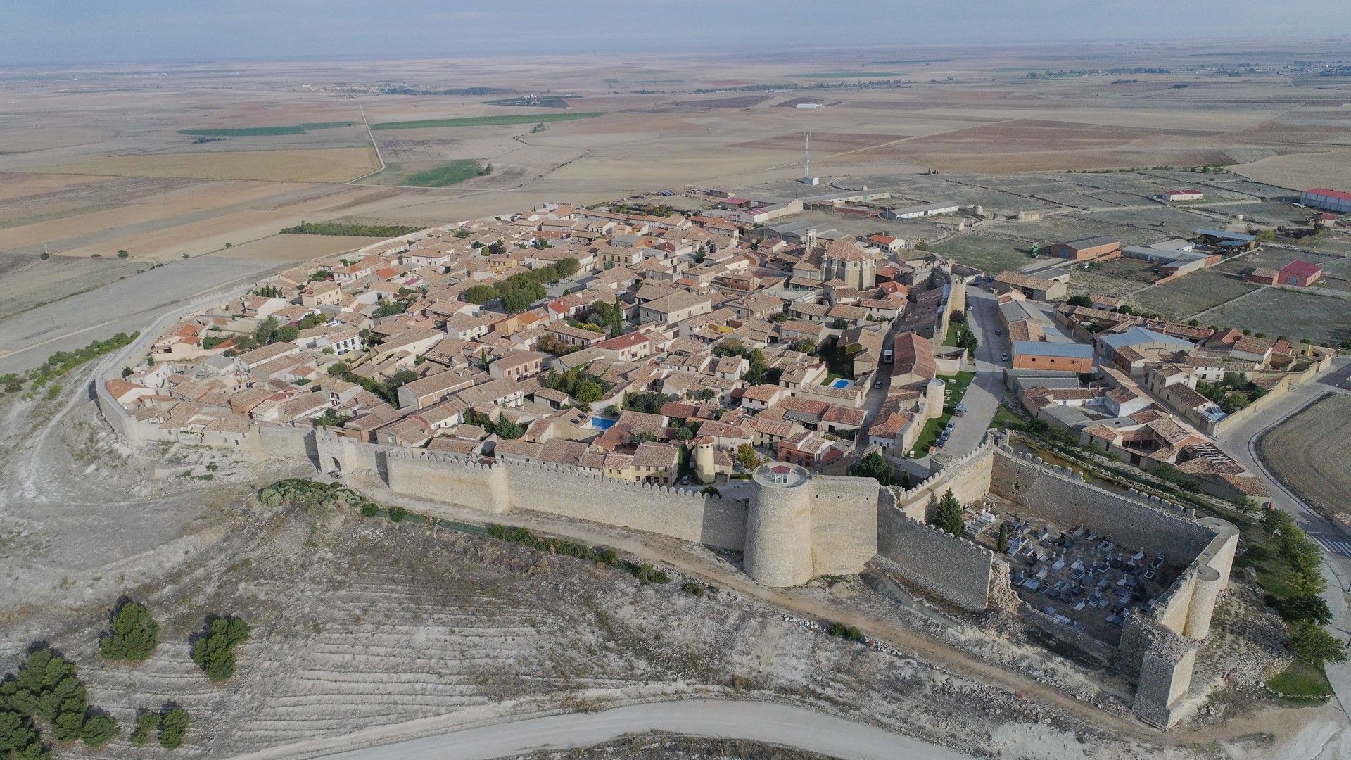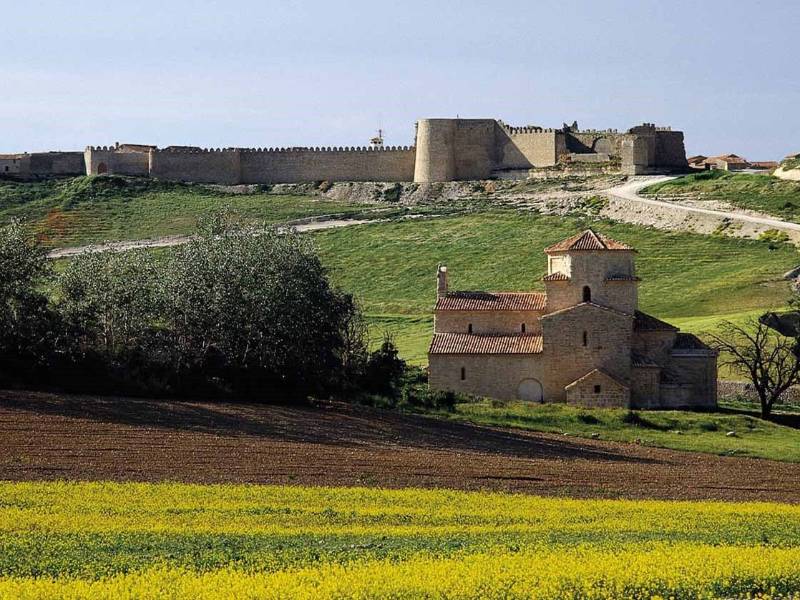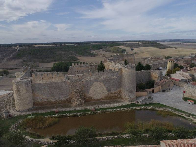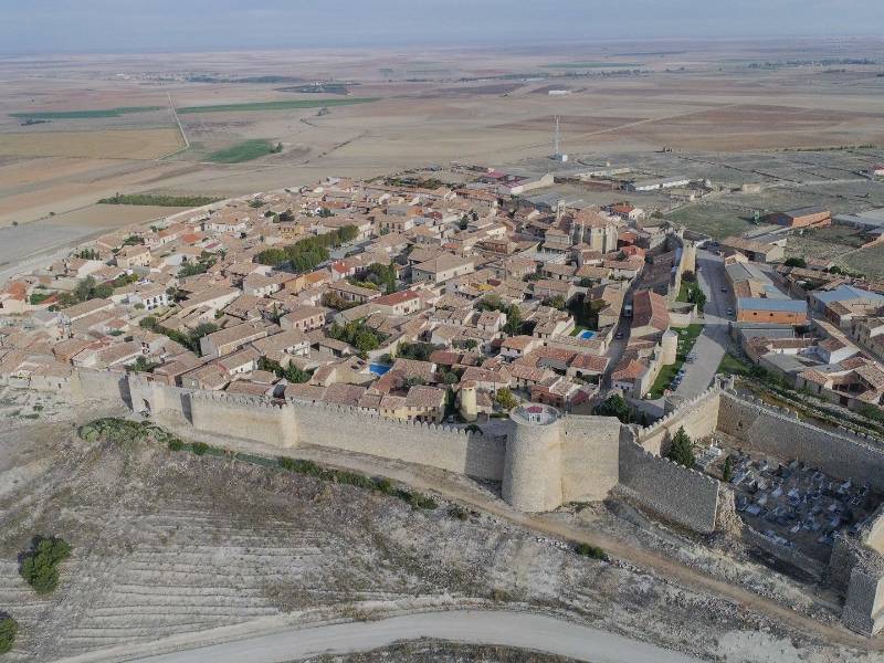 The walled structure hugs the jagged side of the bleak plateau, overlooking the vast Tierra de Campos. The castle has a square ground plan, with round cubes reminiscent of the fortress in Toro. The space between the wall and the castle might have been a defensive yard.