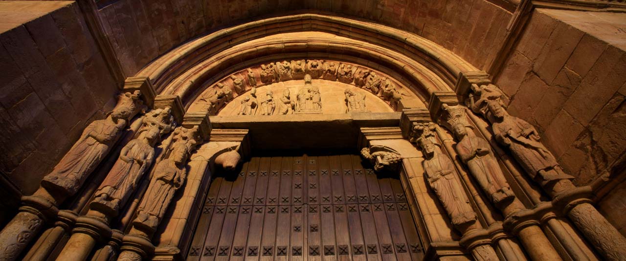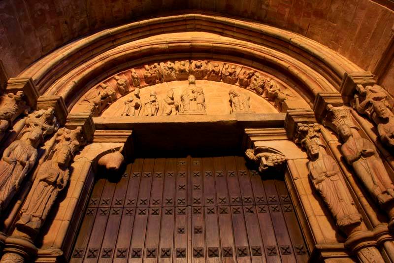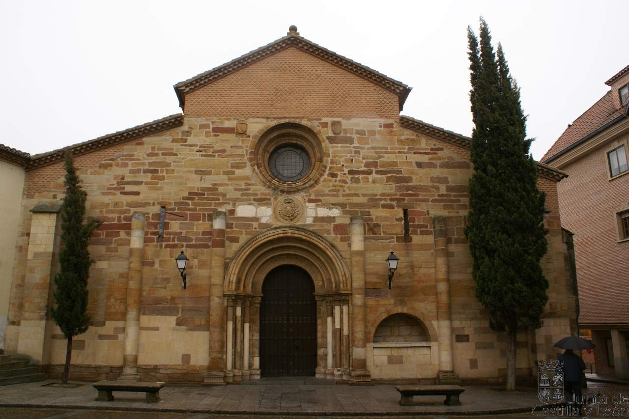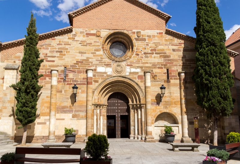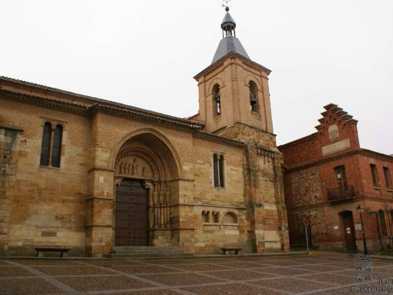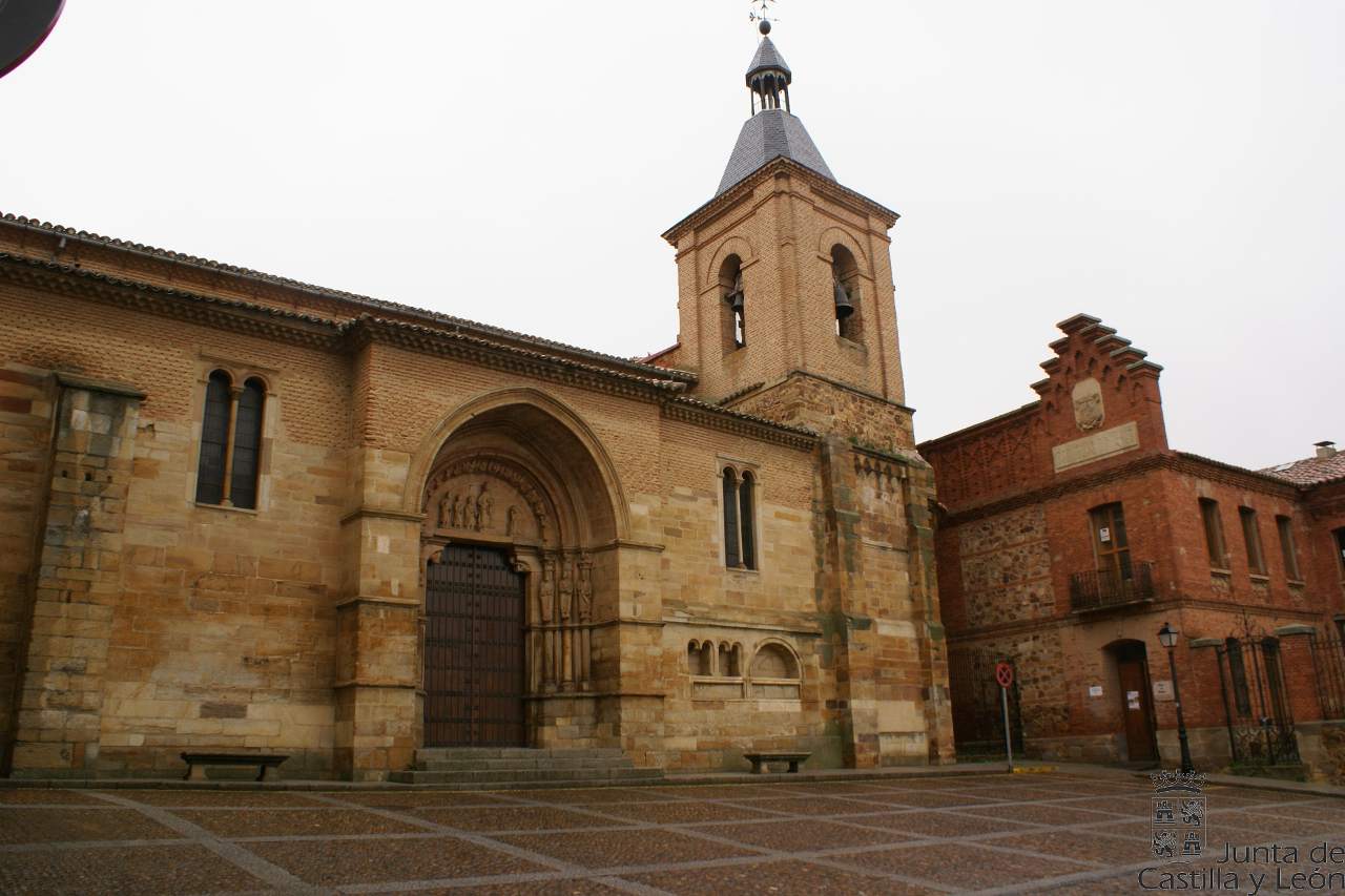 Iniciada en piedra de sillería en el año 1182, fue terminada muchos años después utilizando ya el ladrillo como elemento constructivo. Presenta un estilo románico, la planta de la iglesia tiene tres naves con un crucero no acusado y tres ábsides en la cabecera. El templo conserva tres portadas entre las que destaca por su amplio desarrollo iconográfico la situada al medio día con el tema de la Epifanía.