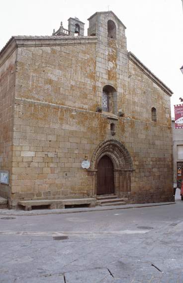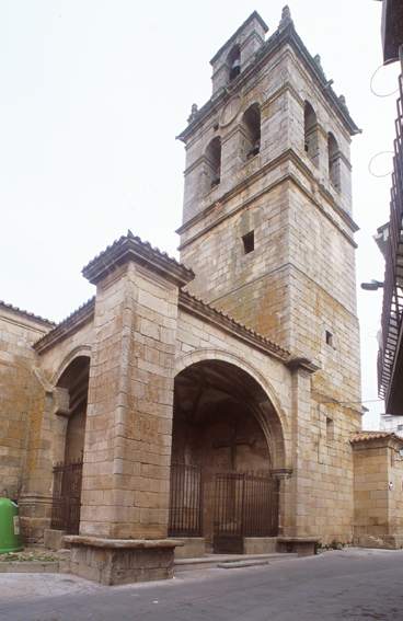 El muro sur y las portadas de este tiempo se conservan. Fue reconstruida más tarde en los siglos XVI y XVIII. De la época tardorrománica son sus portadas, siendo la más importante la del lado sur. Las dos están decoradas con arcos apuntados, con triple arquivoltas decoradas con motivos florales, cabezas humanas, puntas de diamantes, rosetas… y protegidos por una chambrana de grandes hojas. Las arquivoltas están apoyadas sobre una imposta y columnas con capiteles de hojas de acanto con volutas. El templo tiene planta de cruz latina y una sola nave reforzada con contrafuertes en la parte exterior. Destaca también en el exterior la torre del campanario de cinco cuerpos.