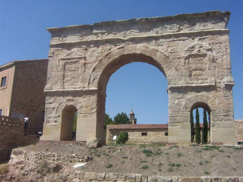 It's an arch from the II and III century, and is the only of triple archery which is preserved in Spain. This Arch of Medinaceli has a simple decoration, and also follows the model of the Trajan arch.