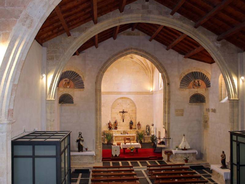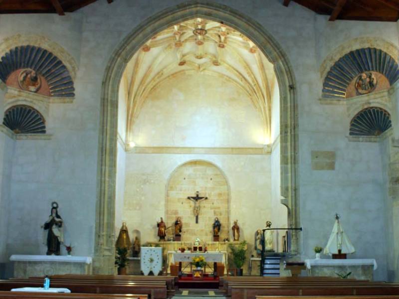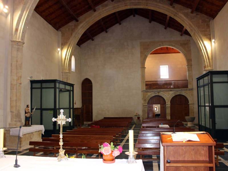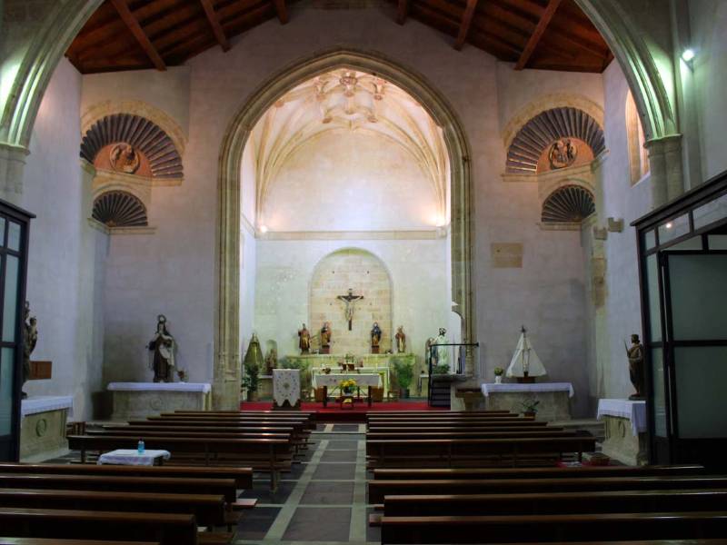 Bâtiment du XVIe siècle, avec une seule nef divisée en deux sections par des arches à diaphragme qui soutiennent une simple couverture intérieure en bois. La chapelle principale, précédée d'un arc de triomphe pointu, est recouverte d'une voûte nervurée étoilée.