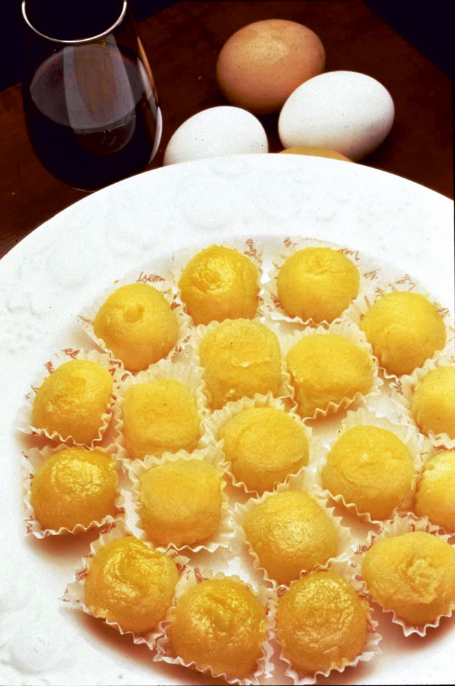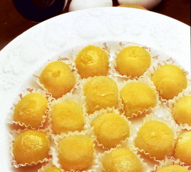 Put to cook about 10 tablespoons of water, the sugar, and the lemon zest, to make syrup, over low heat and stirring continuously. Next mix and whisk the yolk with sugar as syrup then add the lemon juice and put to low heat, without letting it boil so that the yolks do not curdle. Let stand the dough for 24 hours on a cold plate. Immediately make a sort of wide laces, sprinkle with sugar, and cut into pieces to round them with the hands. Finally put those in some white paper molds; the sugar can be caramelized with an element or hot iron.