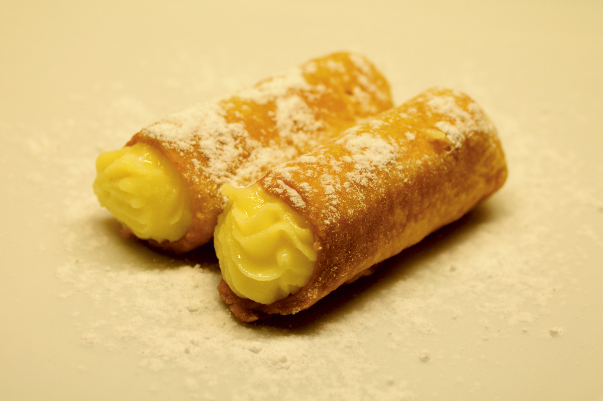Para fazer o recheio, ferva em uma panela 750 ml. de leite com as raspas de limão. Numa tigela separada misture o leite restante (250 ml.) com as gemas, o açúcar e o amido de milho, mexendo até obter uma massa homogênea. Essa massa é adicionada ao leite e mexida por três ou quatro minutos para que o leite não ferva. Retire do fogo, acrescente a manteiga mexendo para diluir e obter o creme final. Guarde e, quando esfriar, recheie o cannoli.