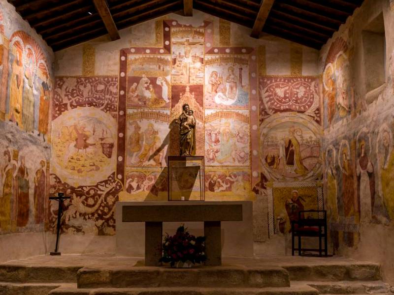 L'ermitage Notre-Dame de Fernandiel, situé dans la ville de Muga de Sayago et construit au XIIIe siècle, est un joyau de l'art roman et un trésor historique de la province de Zamora. Bien qu'il ait subi plusieurs modifications au fil du temps, sa plus grande valeur réside dans les impressionnantes fresques qui ornent plusieurs de ses murs, considérées comme la plus grande collection de peintures murales de la région. C'est pourquoi certains le surnomment la « Chapelle Sixtine de Sayago ». Ces peintures, peintes dans la première moitié du XVIe siècle, ont retrouvé toute leur splendeur grâce à une récente restauration, qui a également donné lieu à la publication d'un livre numérique consacré à la préservation et à la diffusion de ce patrimoine unique. Les fresques sont réparties dans la chapelle principale, la nef et l'arc de triomphe, représentant des scènes telles que l'Adoration des Mages, la Nativité, l'Assomption de la Vierge et un Christ crucifié au Calvaire. Il convient également de souligner la sculpture de la Vierge Marie avec l'Enfant Jésus, placée de manière à ce que les fidèles puissent la voir depuis l'entrée du temple.
