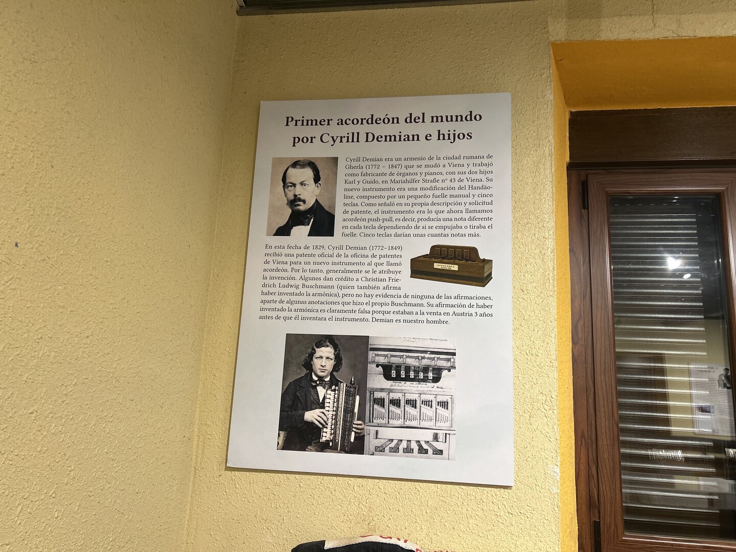 The museum is equipped with explanatory panels on the origins of the accordion and its most notable manufacturers since its inventor, the Armenian naturalized Austrian, Cyrill Demian (1772-1847), received an official patent from the Vienna Patent Office in 1829 for a new instrument he called the accordion.