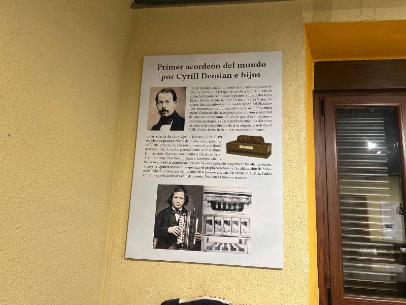 El museo está dotado con paneles explicativos sobre los orígenes del acordeón y fabricantes más destacados desde que su su inventor, el armenio nacionalizado austriaco, Cyrill Demian (1772-1847), recibiera en 1829 una patente oficial de la oficina de patentes de Viena para un nuevo instrumento al que llamó acordeón.