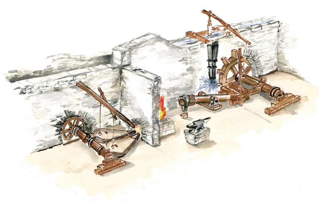 La forge, ou « usine sidérurgique », était un lieu où l'on obtenait du fer à partir de minerai brut. Cette forge utilisait la force d'une chute d'eau pour actionner le marteau et le système d'alimentation en air.