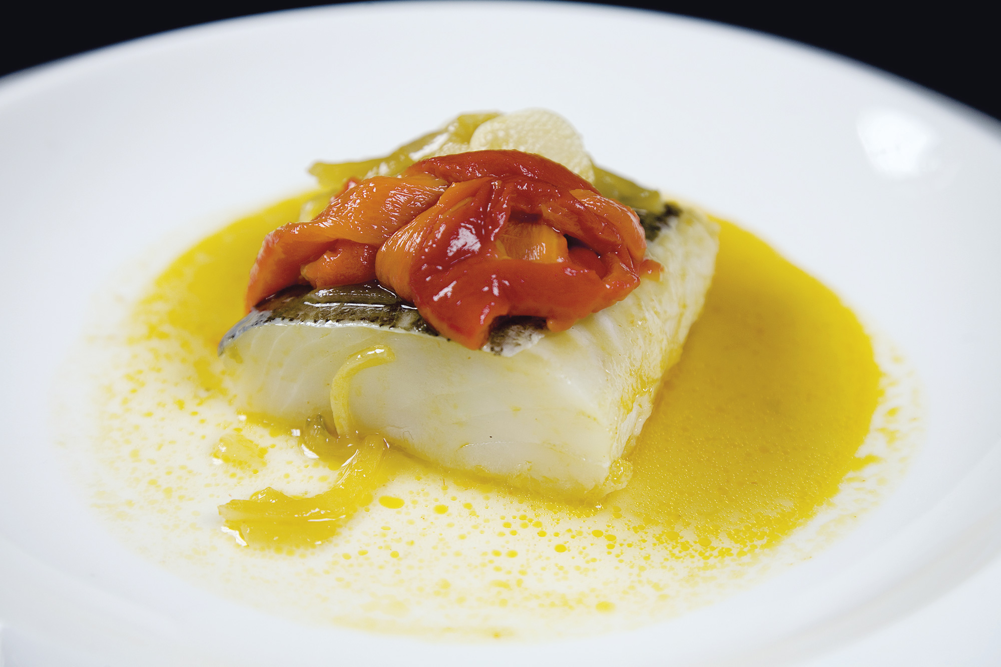 Cut the onion and pepper into thin slices. Heat the oil and add the garlic, previously cut into slices. Fry it. Next add the onion and pepper and poach it for about fifteen minutes and season it. Arrange half of the fried sauce in a clay pot. Place over the cod, cut into four equal portions, and cover it with the other half of the fried sauce. Put the pot into the previously heated oven, in medium heat, and cook it for about twenty minutes approximately.