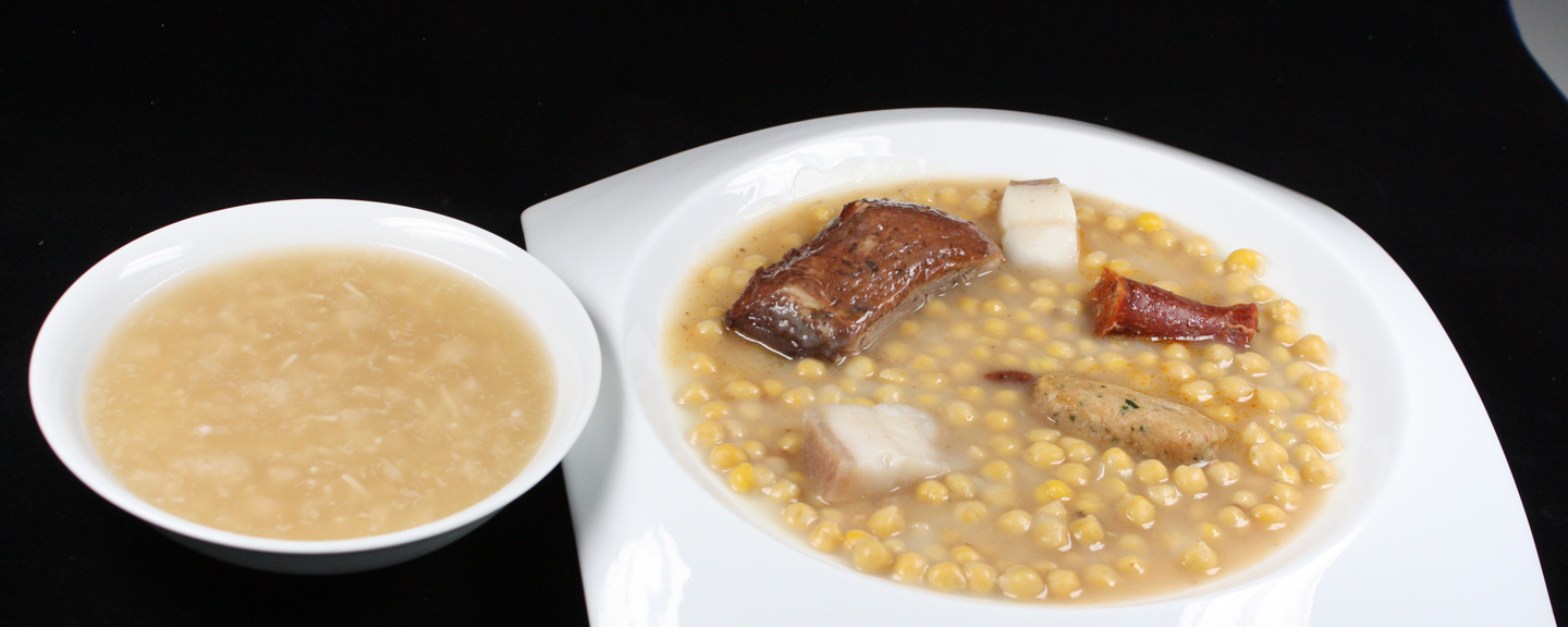 For the presentation, serve the chickpeas with the meat, the chorizo, the bacon, and the stuffing. Serve the soup separately.