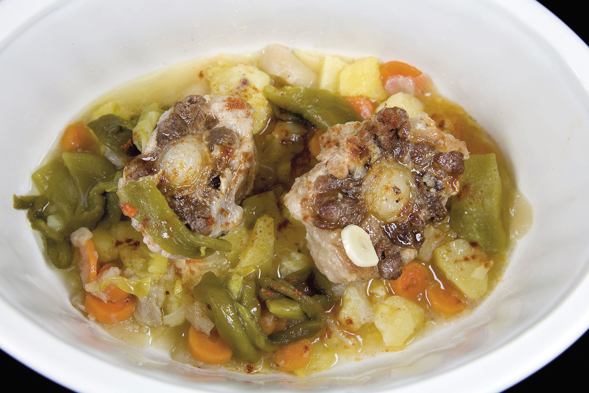 Heat the oil, add the chopped oxtail, season it and fry lightly over high heat about ten minutes stirring it. Add all the chopped vegetables and continue frying lightly for 15 minutes stirring occasionally. Add the chili. Add the brandy and red wine and fry it lightly five minutes. Add the beef broth (or failing this, water) and simmer it one hour approximately until by pricking it with a fork, the meat is tender.