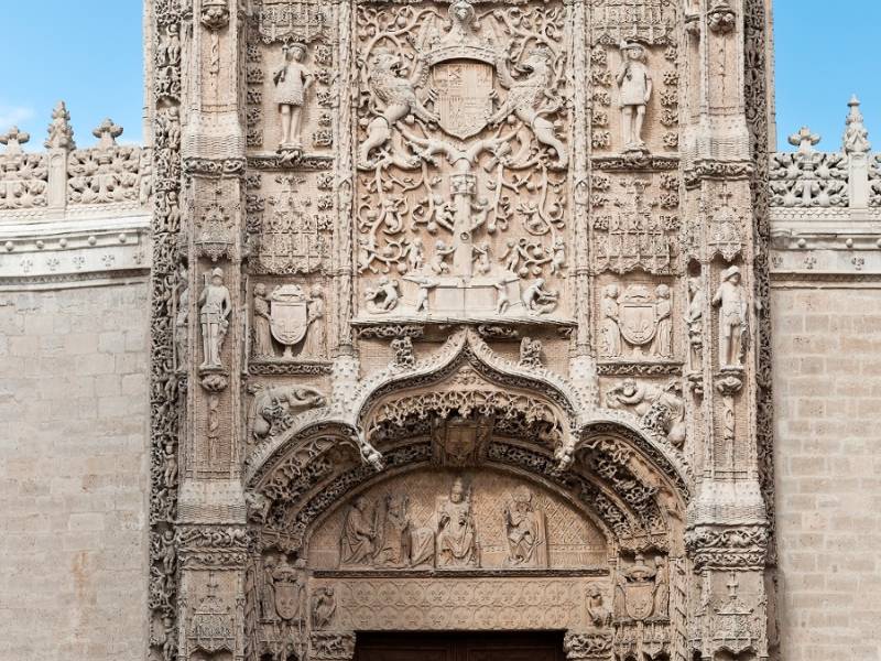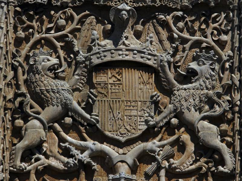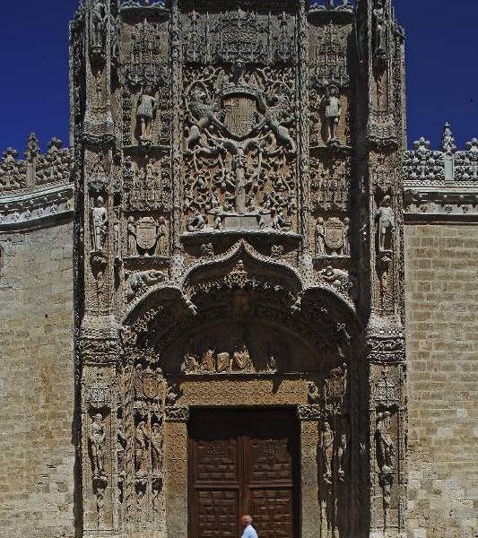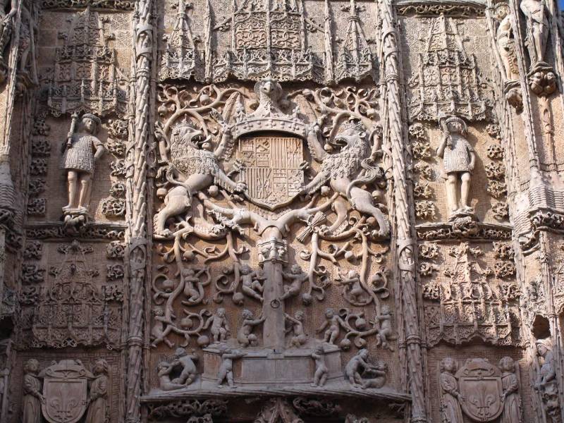 The elaborate façade features a wealth of figures ranging from soldiers to savages, saints and popes, presided over by the Catholic Monarchs among the branches of the Tree of Life, in an allegory created by the theological scholars that once lived here.
