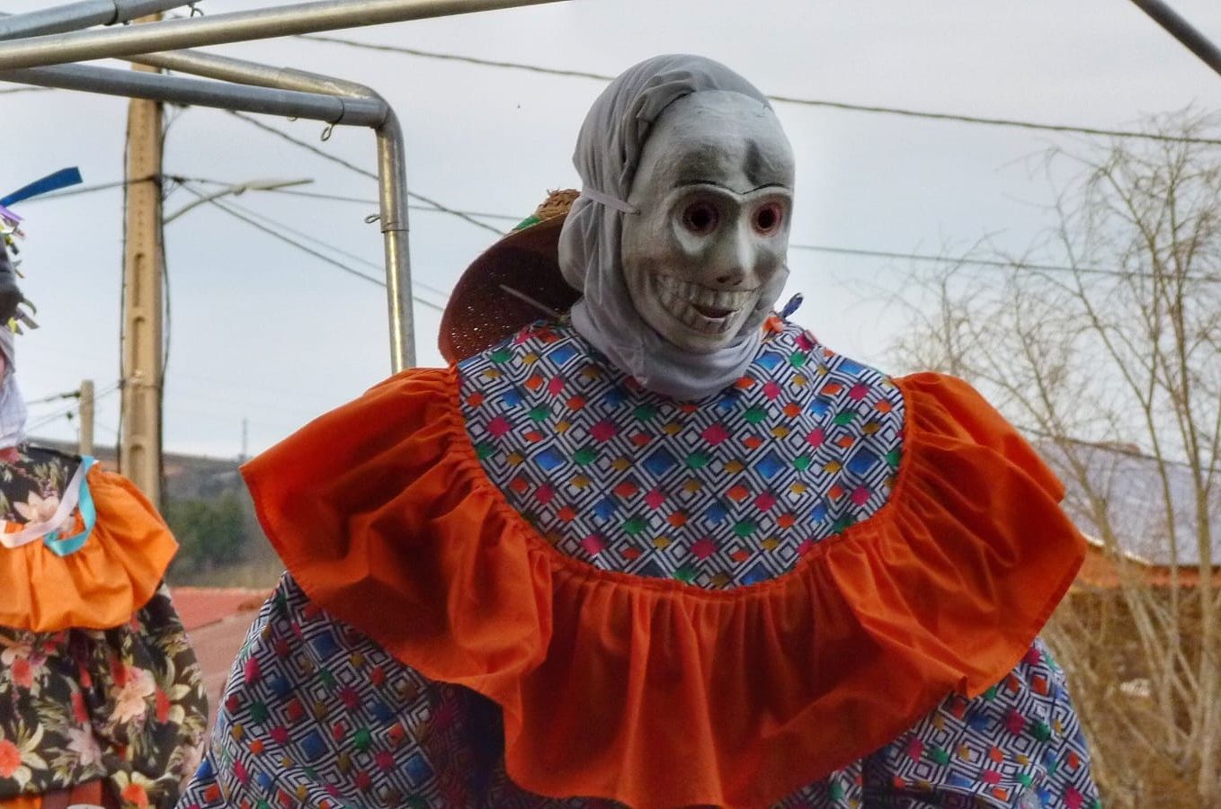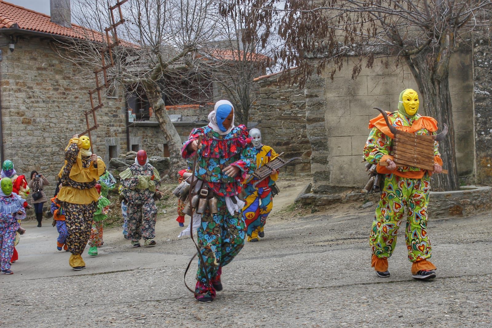 The traditional clothing consists of brightly coloured suits with floral or harlequin prints, with blouses and loose trousers. The masks, hand-made by the locals, are usually made of pressed paper, wax or leather. To conceal their identity, they cover the back of their heads with scarves or rags. The most characteristic feature is the cowbells they wear tied to their waists, the number of which varies, and which resonate throughout the village during the celebrations.