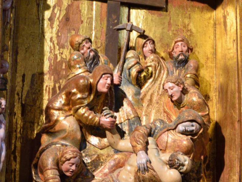 Collateral altarpiece of the epistle belonging to the third quarter of the 16th century and dedicated to the cycles of the Passion and Glory of Christ . Its masonry is made of pine wood and consists of a predella, two bodies of three streets articulated by stylized columns with carved shafts and side straps. The altarpiece was polychrome in 1563 by the painter Martín Alonso. The central street is occupied by the sculptural groups of the Descent and the Flagellation , while on the sides there are brush stories related to the Resurrection and Glory of Christ . Restored in 2005.
