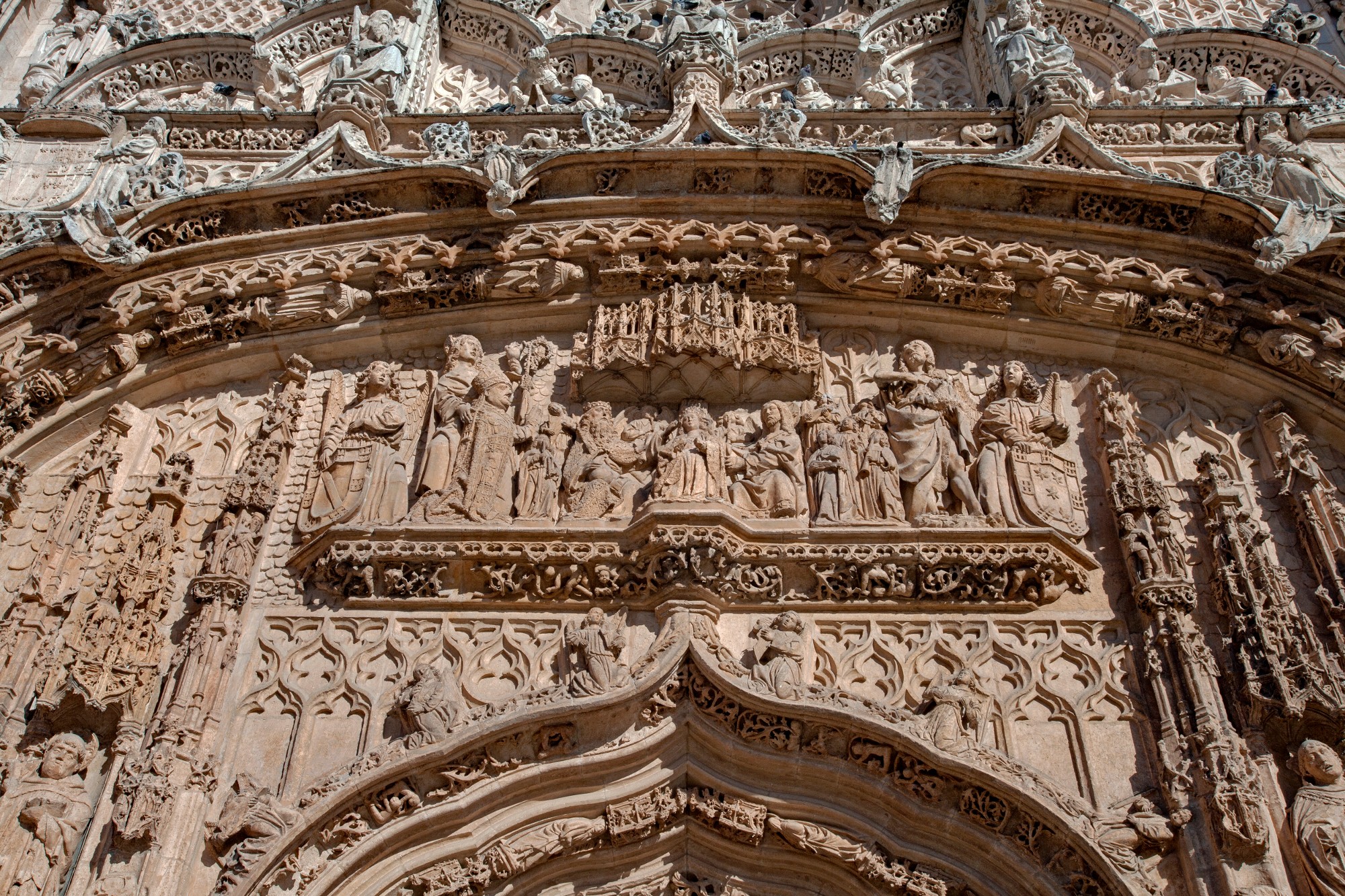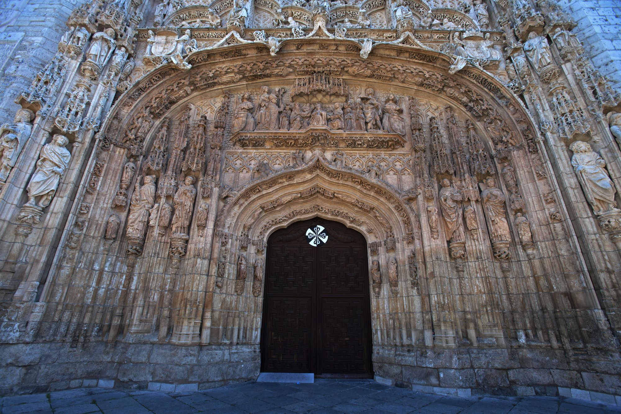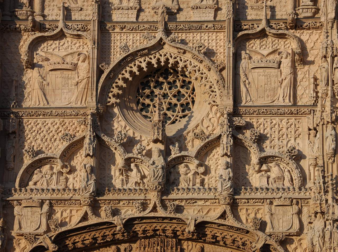 立面构成了一个巨大的石雕祭坛画。由西蒙·德·科洛尼亚 (Simón de Colonia) 制作,分为两部分:第一部分延伸至玫瑰窗上方的壁架,两侧是两个尖顶。立面的第二部分位于滴水嘴线上方,星形背景代表罗哈斯家族的徽章。