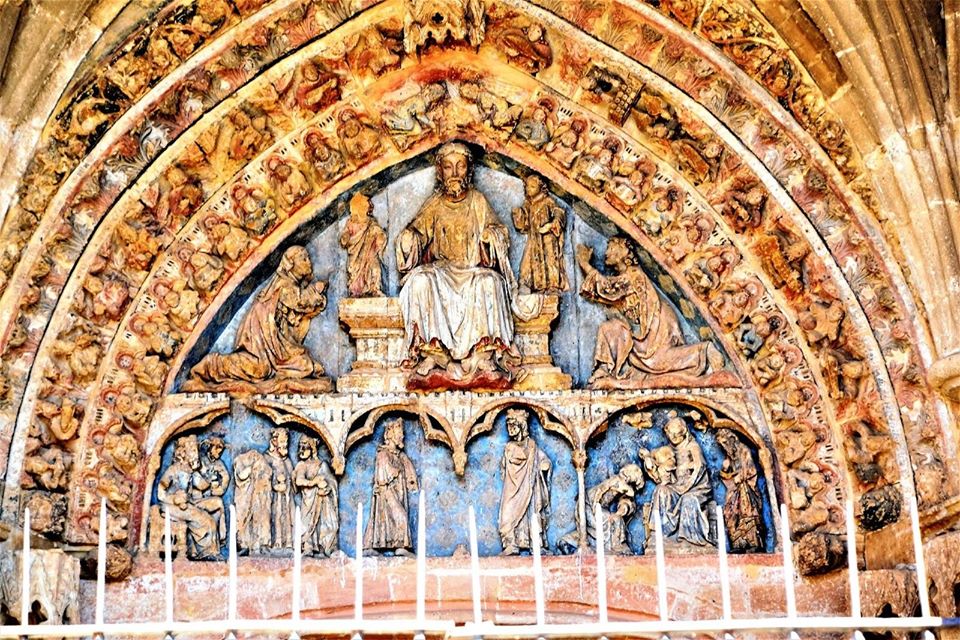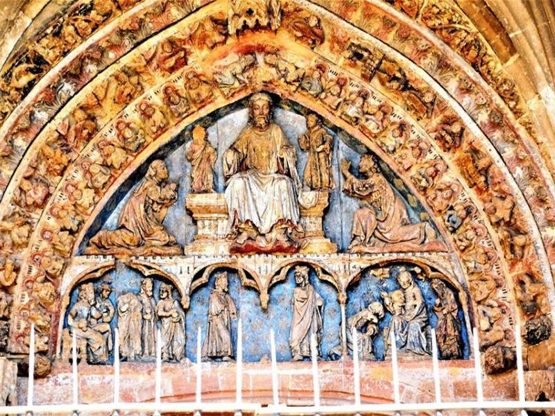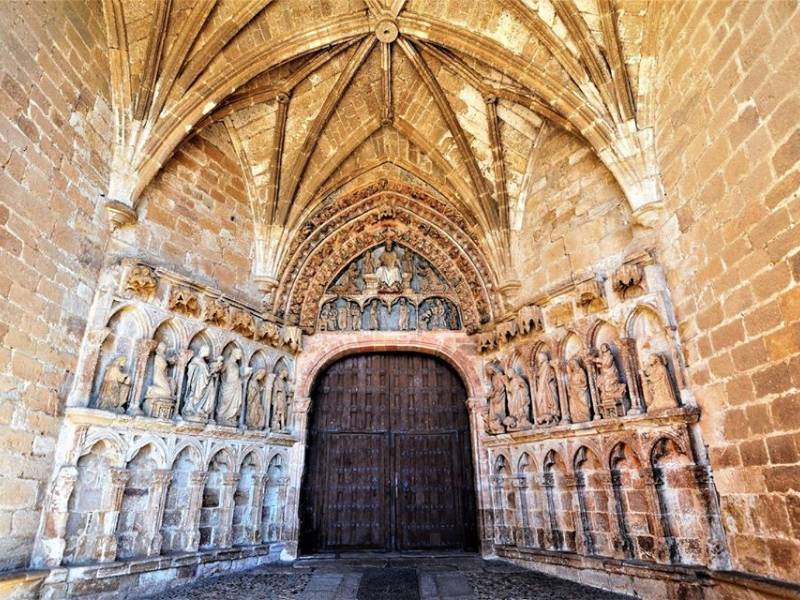 To the south of the central section of the nave a spectacular Gothic portal opens, sheltered under a wide portico with a ribbed vault. On the sides of this cover we find two galleries of blind arches, the lower ones rest on a continuous bench and the upper ones, sheltered by canopies, contain sculptures of saints and biblical characters among which would be the Virgin of La Hiniesta, an announcing angel and another Virgin in a state of good hope who moved into the temple. The highlight of the cover is perhaps the tympanum, divided into two registers: inside the farewell of the Magi to Herod is represented until their arrival in Bethlehem; in the superior one, Christ Judge between San Juan and the Virgin.