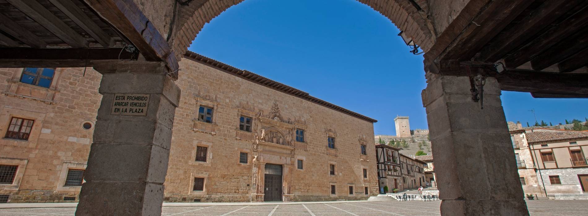 Castilian plaza with arcades enclosed by the palace, the church and the arch of the town walls. In the centre is a magnificent 16th century monument.