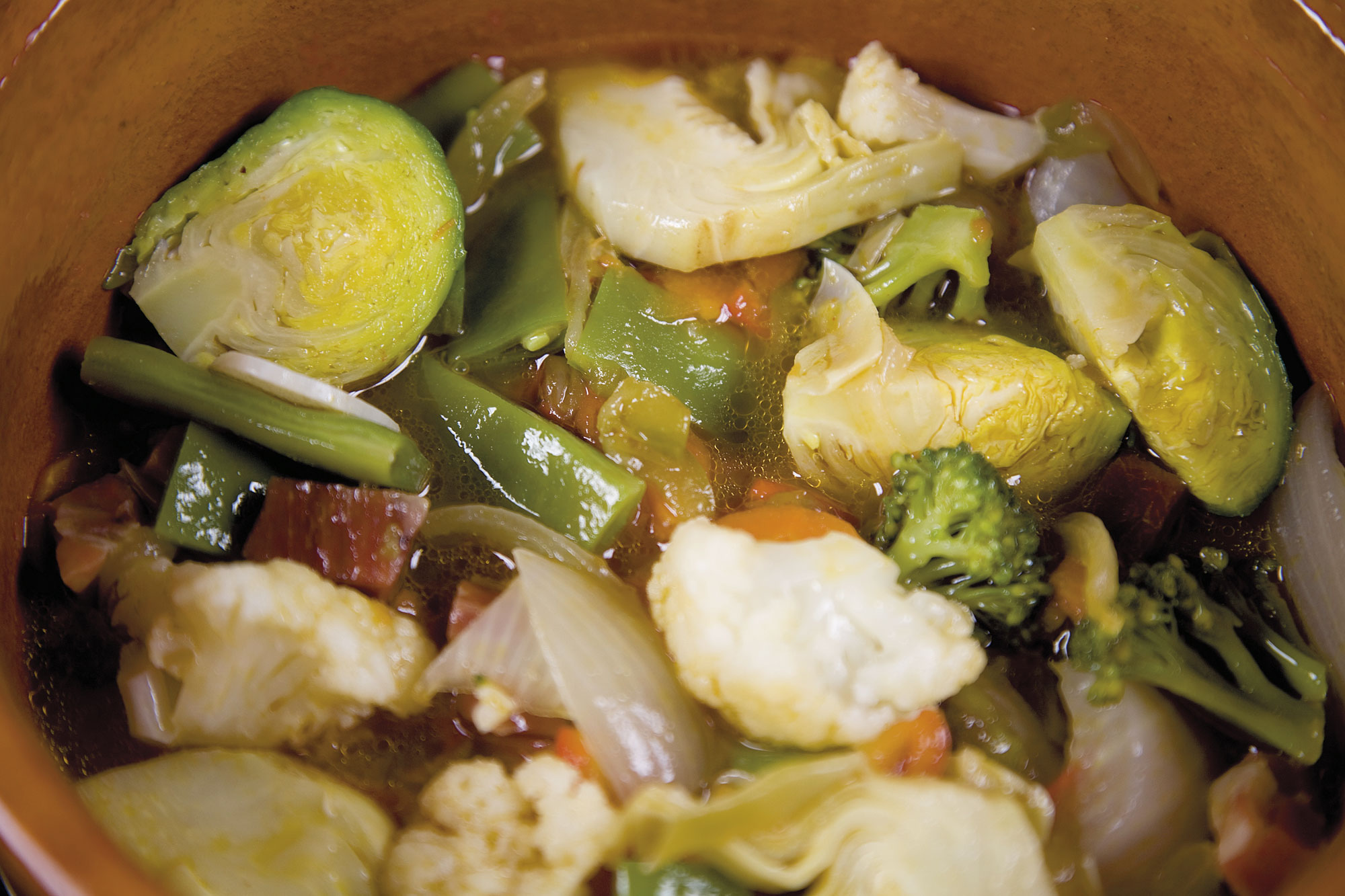 - 1 kg de verduras de temporada: alcachofas, guisantes, espárragos, pimientos, zanahorias, coliflor, coles u otras dependiendo de la estación del año.