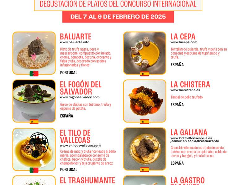 A partir de este año 2025, el Concurso ‘Cocinando con Trufa’ tendrá un carácter anual y lo hará alternando la convocatoria internacional con una convocatoria Ibérica (España y Portugal) que se inicia este año. De esta forma, esta V edición se desarrollará en Soria del 7 al 9 de febrero con diferentes actividades de promoción abiertas al público. El concurso culinario se celebrará el sábado 8 de febrero en el Palacio de la Audiencia, con la participación de ocho equipos de cocineros, dos procedentes de Portugal y seis de diferentes comunidades autónomas de España: Castilla y León, Canarias, Cataluña, Comunidad Valenciana, Aragón y Asturias.