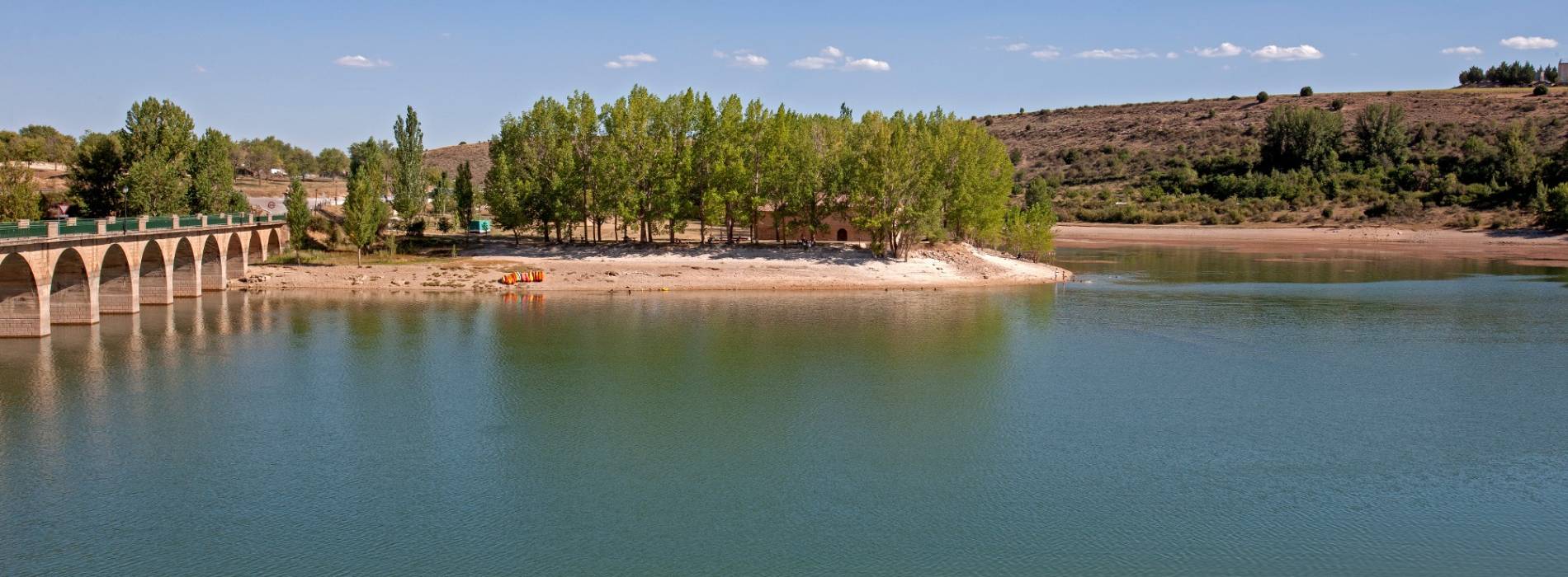 Desde la zona alta se contemplan los restos de la ermita de Linares, cuyo ábside y espadaña emergen de las aguas en cuanto desciende un poco el nivel del embalse.