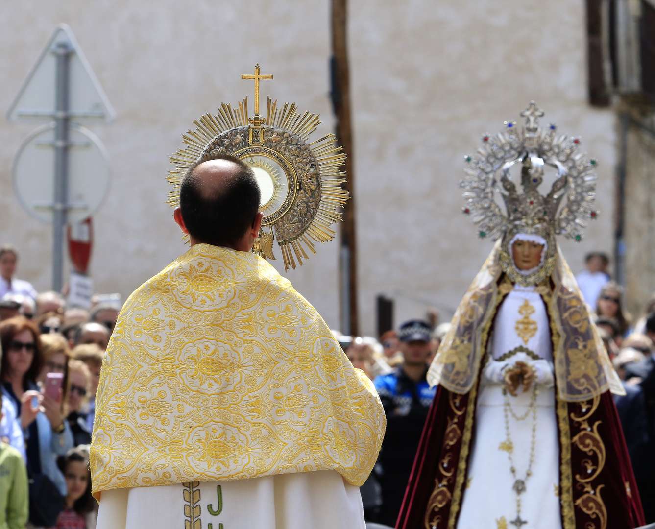 En este acto, una imagen de la Virgen, cubierta de un velo negro, de luto, y acompañada de la música triste de la Banda Municipal, sale en procesión desde la iglesia de Santa María hacia la medieval Plaza del Coso. Allí es depositada sobre una peana que se encuentra situada entre dos altas torres de armazón de madera cubierto con damasco rojo. En un momento determinado, cuando la Virgen ya está asentada, de la parte superior de una de las dos torres sale un gran globo blanco, de tela, que es movido desde siempre por un juego de maromas que unen las torres en su parte más alta. El globo se para a la mitad del espacio entre las dos torres, en lo alto, y se abre dejando ver en su interior a un niño vestido con la blancura candorosa de los ángeles y adornado con una corona dorada y sendas alitas. Gracias a un sistema de poleas, el ángel desciende colgado, suelta dos palomas y llega a entrar en contacto con la Virgen que se encuentra bajo él. Entonces le quita el velo negro a la enlutada madre de Cristo y es elevado otra vez pataleando y moviendo frenético el velo. La multitud rompe en aplausos y la Banda Municipal toca el himno nacional. Se ha representado la Resurrección del Salvador.