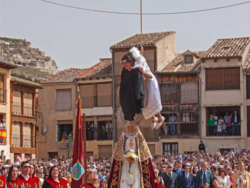 Toda la serie de procesiones y actos litúrgicos que acompañan la Semana Santa tienen su broche y colofón en una tradición casi única: la Bajada del Ángel. Esta representación simbólica de la Resurrección de Cristo tiene solo dos paralelos en toda España, en Aranda de Duero y en Tudela de Navarra. Hay noticia documental del acto desde el siglo XVIII, pero seguramente es más antiguo y remonte, como otras representaciones religiosas, al impulso posterior al Concilio de Trento.