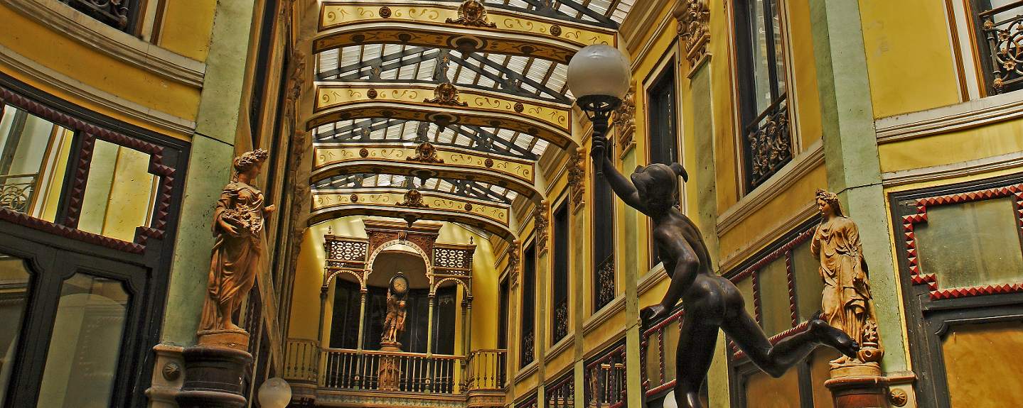 Las cubiertas del pasaje constituyen un sistema independiente del resto del edificio. La estructura que las soporta es de madera salvo en la cubierta de la rotonda central, realizada en hierro y teja de vidrio. Los techos se adornan con pinturas de Salvador Seijas y ornamentación de estucos y motivos vegetales. Las puertas de ingreso son de rejería, de distinta composición y llevan las fechas de su construcción 1885-86 y la inscripción 'Pasaje Gutiérrez'.