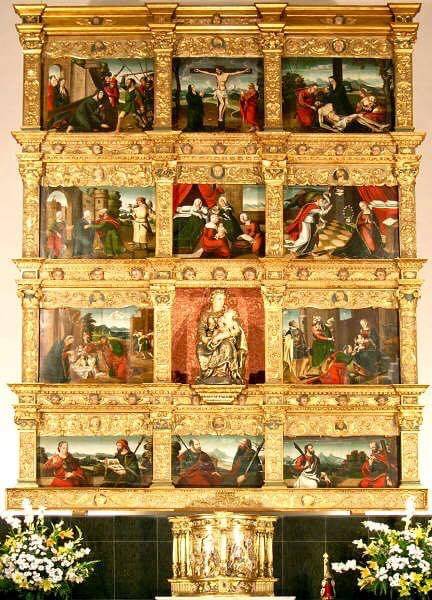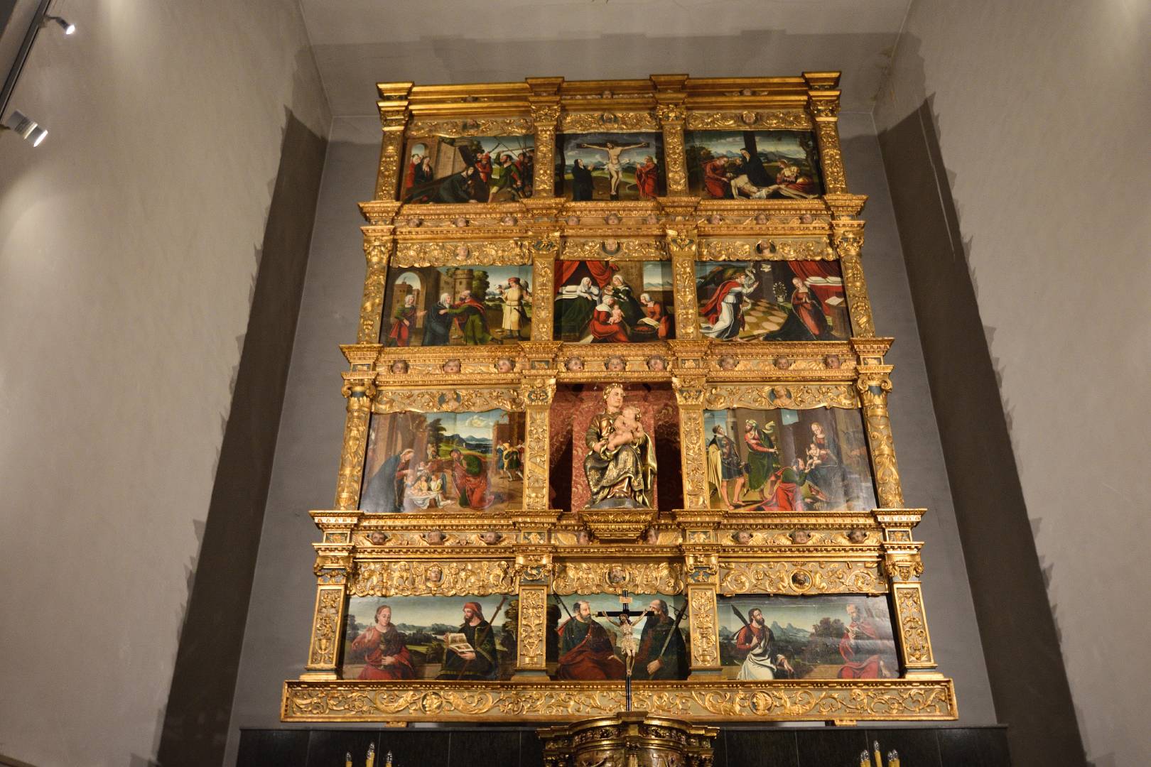 Este retablo renacentista, procedente de la iglesia de la Vera Cruz de Valderas y elaborado durante el segundo tercio del siglo XVI, está compuesto por una mazonería dorada, policromada y ricamente decorada con grutescos y motivos a candelieri. A través de una sucesión de pilastras y entablamentos, el conjunto se organiza en cuatro cuerpos de tres calles. Solo la calle central del segundo cuerpo acoge una imagen de bulto redondo de la Virgen con el Niño, mientras que el resto vienen ocupadas por tablas pictóricas en las que, sobre un grupo de seis apóstoles que conforma el piso inferior, se narran episodios de los ciclos de la Infancia de Jesús y de la Virgen María, así como un grupo de tres tablas en el piso superior con imágenes de la Pasión.