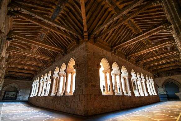 De inicio románica, iglesia de tres naves del XVI y crucero, el ábside es del XIV. Destaca el claustro del XIV que conserva tres de sus galerías y su artesonado mudéjar. La base de la torre de aspecto militar es el único resto románico conservado.