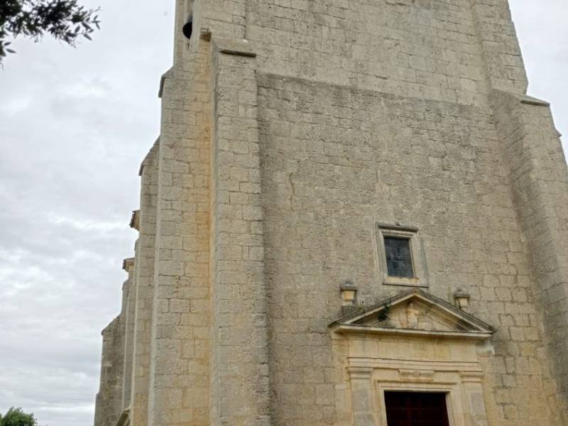 La iglesia está construida en piedra de sillería y sillarejo, tiene planta de una sola nave con cuatro tramos, más el santuario con fondo ochavado. El abovedamiento es de piedra de cantería. En el exterior el edificio es sobrio en líneas, con austeros contrafuertes y una torre a los pies del templo.