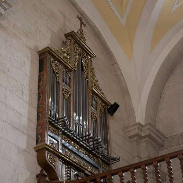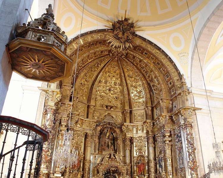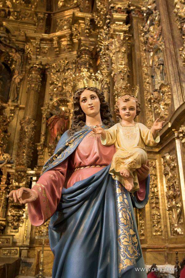 En el interior, de tres naves, separadas en cuatro tramos con pilares y arcos de medio punto, y cubiertas con bóvedas de yesería que forman puntas de diamantes. El crucero se cubre por una cúpula que descansa sobre pechinas, donde figuran los escudos de los patronos de la iglesia. El coro alto se reconstruyó a mediados del este siglo. En el lado del Evangelio, se conserva la cabecera de una iglesia románica de finales del siglo XII, restaurada y convertida en capilla bautismal.