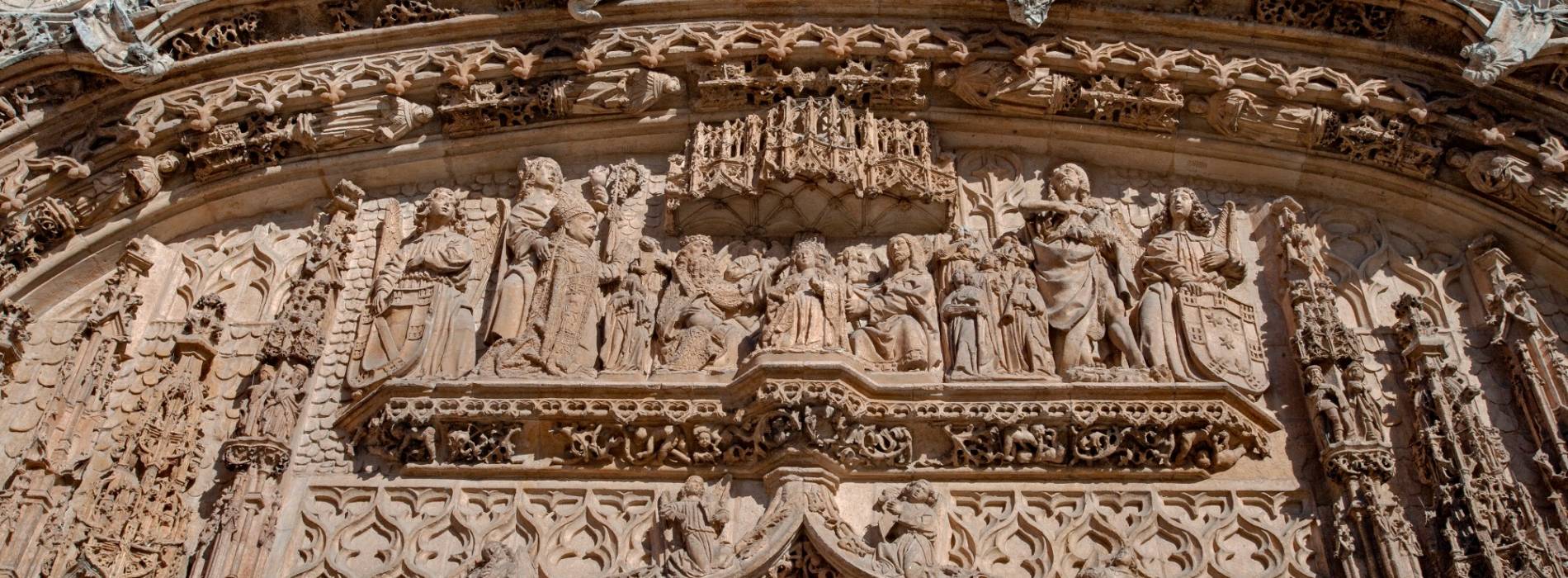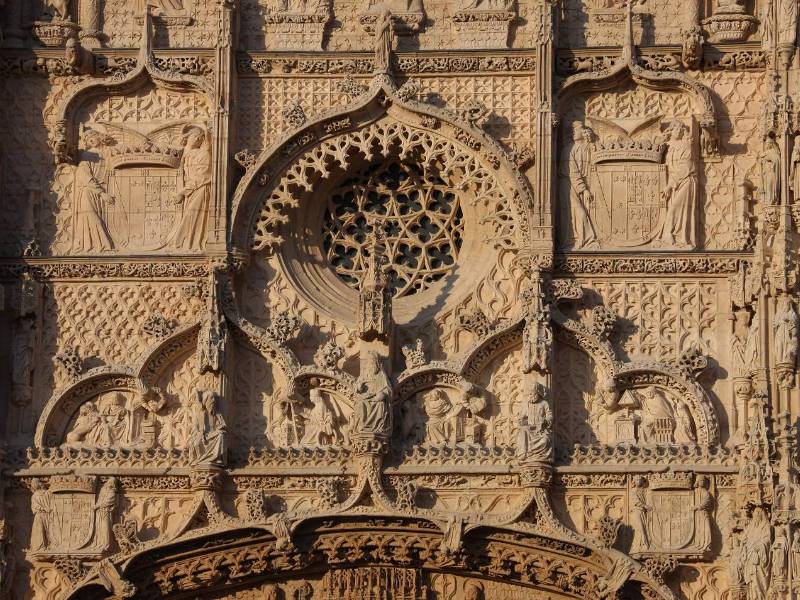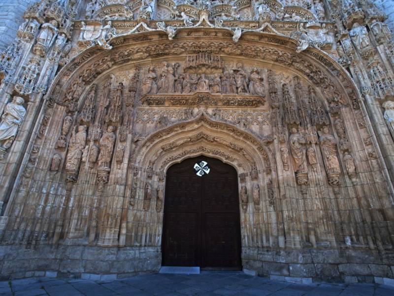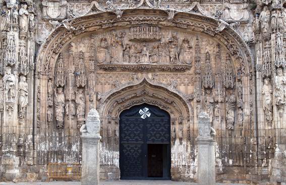 Su fachada constituye un monumental retablo de escultura en piedra. Es obra de Simón de Colonia y tiene dos partes: la primera hasta la imposta situada encima del rosetón y sus límites laterales quedan determinados por dos agujas. La segunda parte de la fachada se eleva sobre la imposta que aparece señalada con gárgolas y el fondo de estrellas se refiere al emblema de los Rojas.