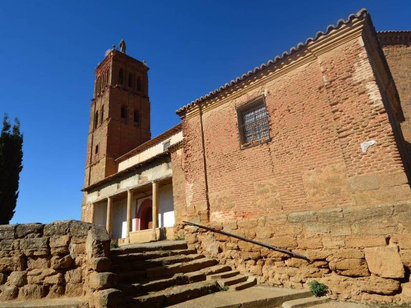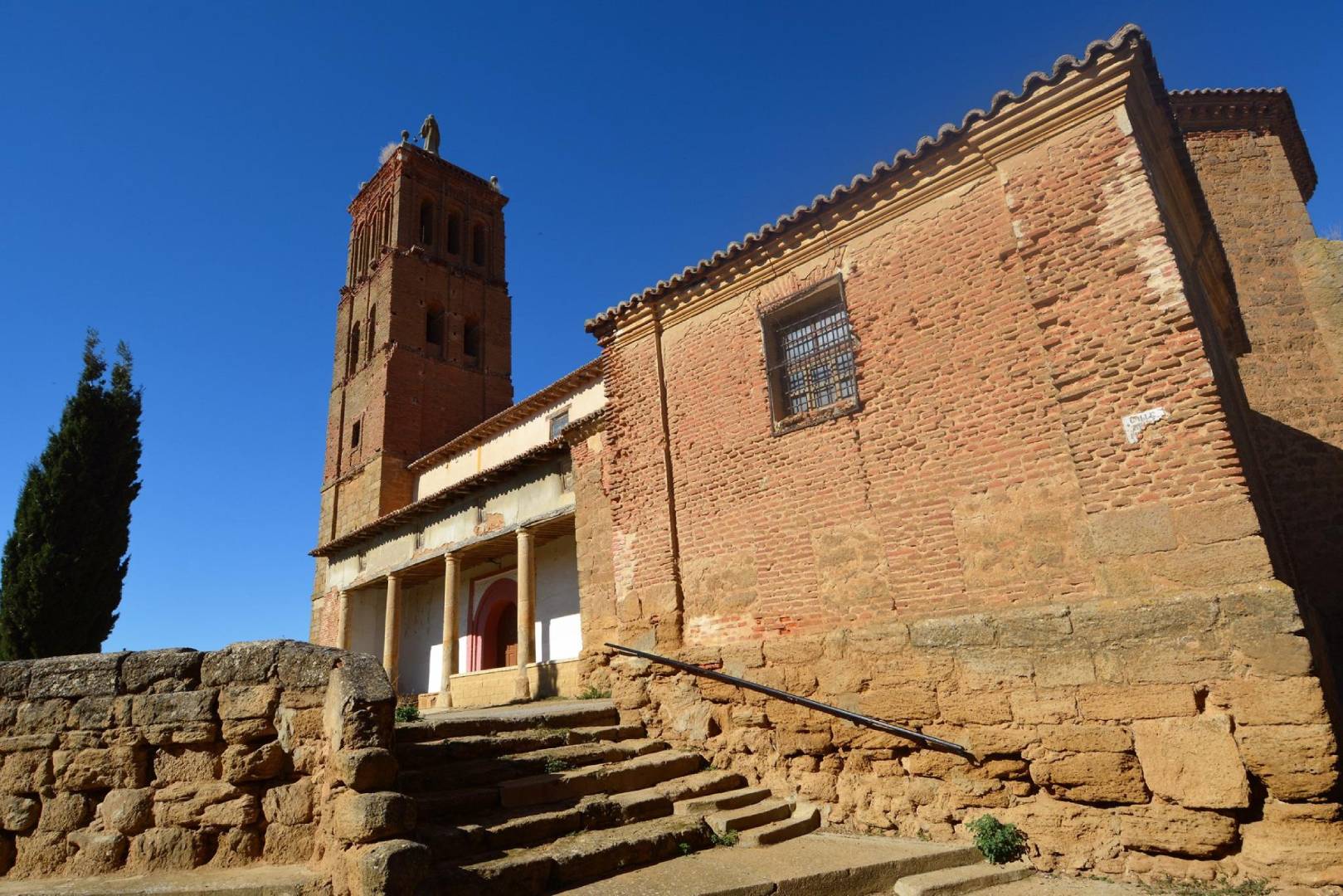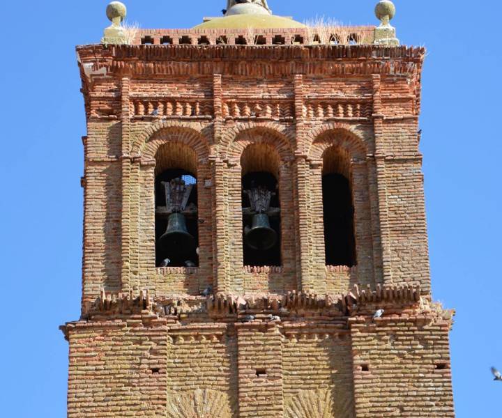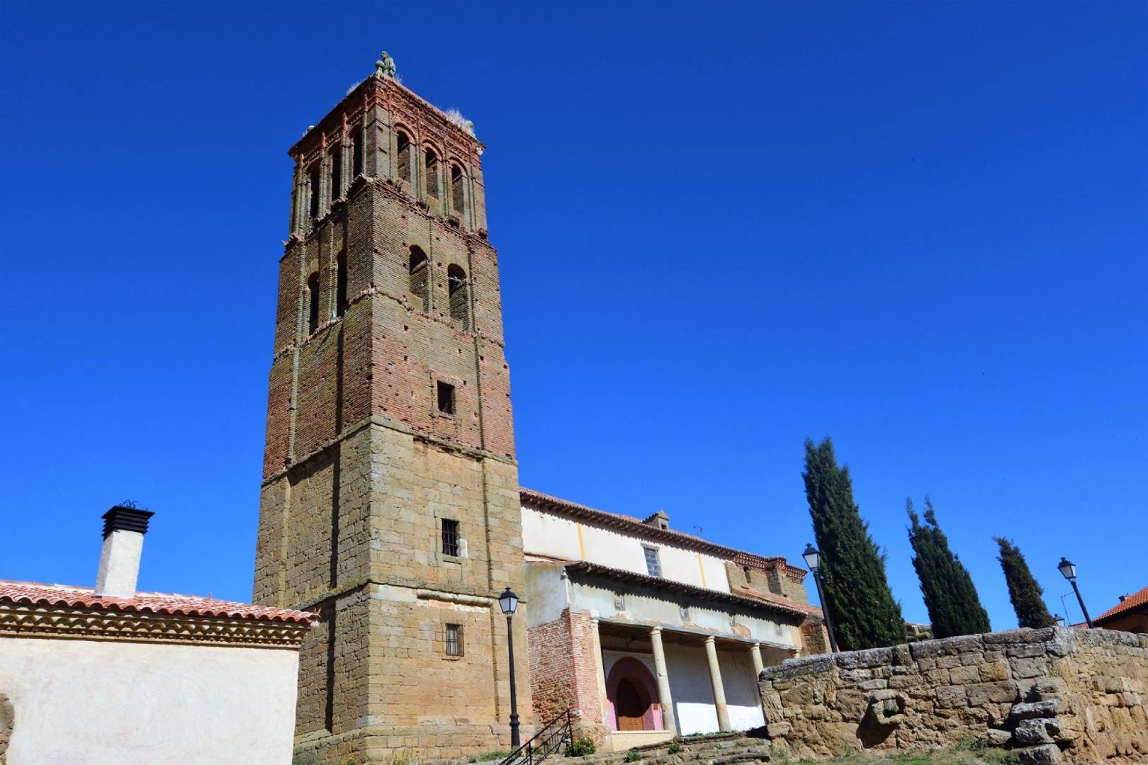 La iglesia, de una sola nave y dos capillas, se hace presente por su monumental torre campanario del S.XVI, restaurada en 2021, con un sólido cuerpo bajo de piedra y los pisos superiores de ladrillo, aligerados con numerosos ventanales. Sobre su cúpula se apoya la estatua del Sagrado Corazón. Dentro, aparte de su bóveda de crucería sobre el presbiterio, interesa el retablo mayor renacentista, formado por múltiples escenas talladas. Fue obra del artista francés Jacques Bernard, quien lo cinceló en el año 1542, en colaboración con varios discípulos. Veinte años después lo policromaron los Carrancejas de León. Ha sido minuciosamente restaurado en el 1999. Entre todos los de su estilo, este conjunto escultórico es uno de los más valiosos y admirables de toda la provincia.